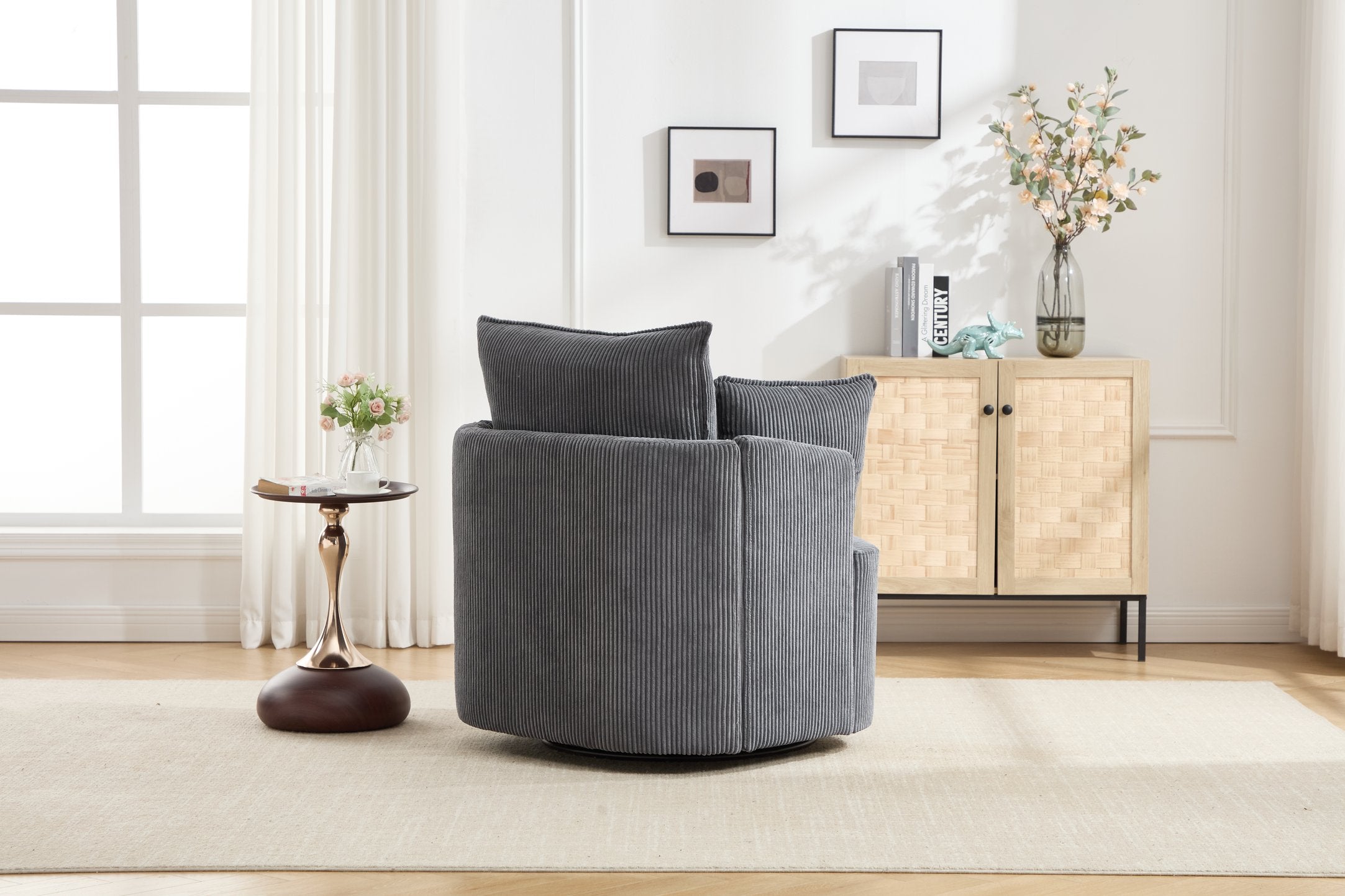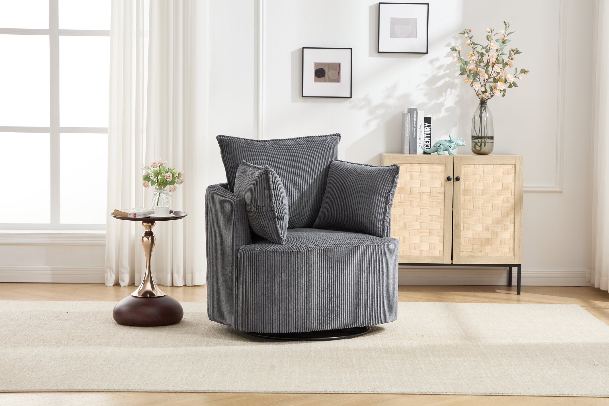 Bring modern sophistication and dependable comfort to any room with this grey swivel accent chair. Designed with a streamlined barrel silhouette and a sturdy metal swivel base, it combines timeless elegance with everyday functionality—perfect for living rooms, bedrooms, home offices, or reading nooks.