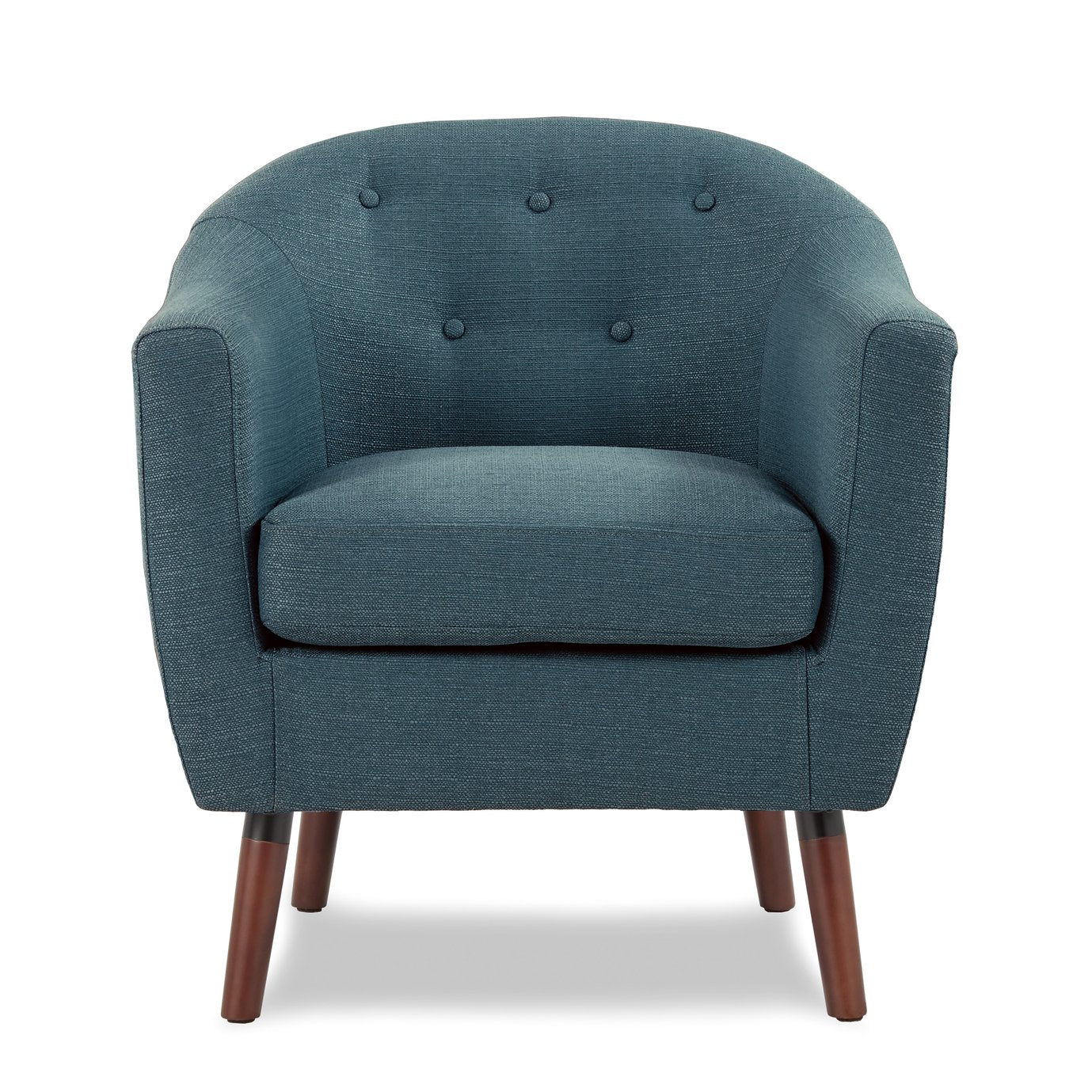 Bring mid-century charm to your living space with this blue fabric upholstered accent chair. Thoughtfully contoured for comfort and styled with button-tufted detailing, the chair pairs a classic silhouette with espresso/cherry-finished solid wood legs for a refined yet approachable look. Versatile enough for living rooms, bedrooms, or reading nooks, it complements both neutral and bold décor palettes.