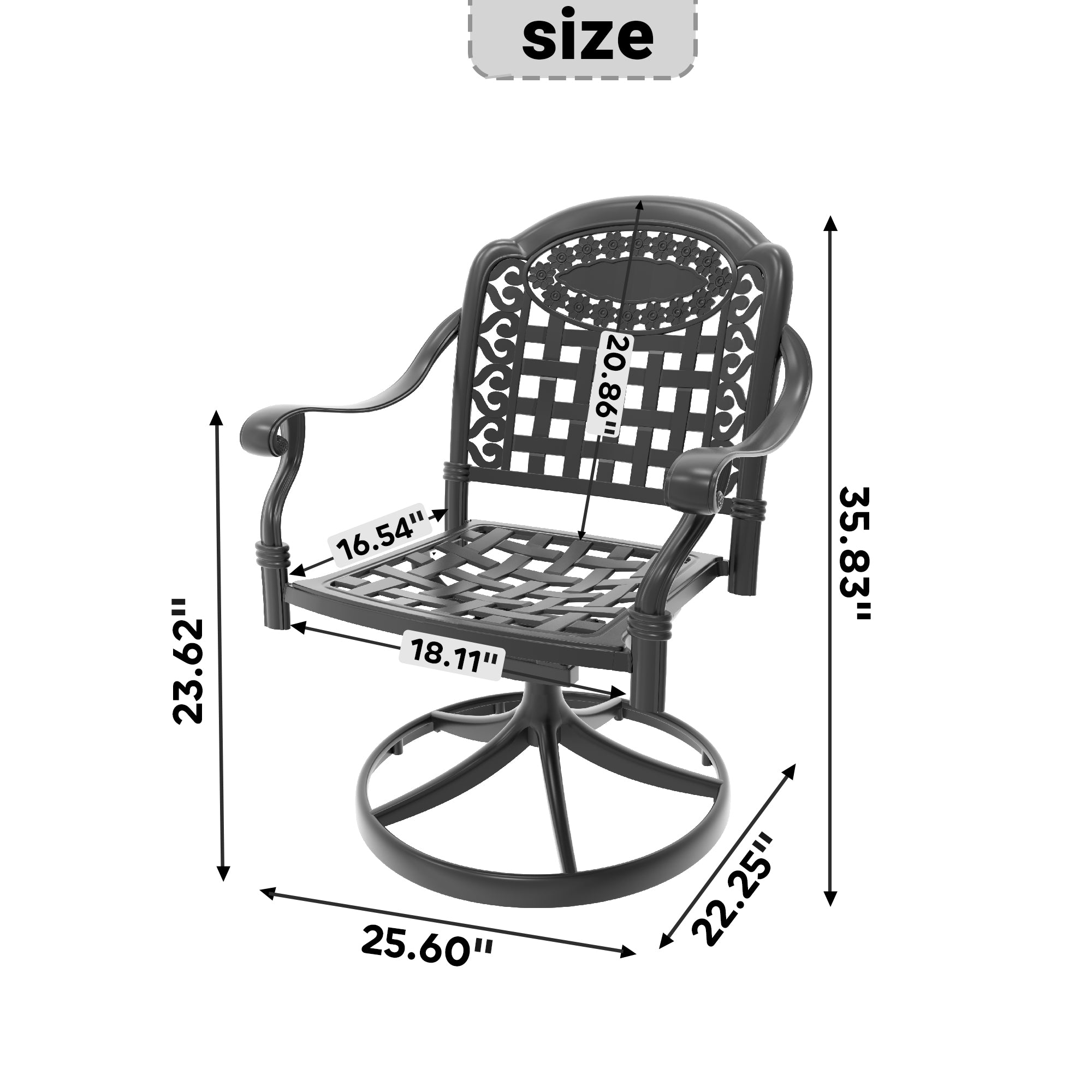 Upgrade your outdoor seating with this stylish and durable two-piece cast aluminum swivel chair set. Designed for comfort and built to last, each chair features a powder-coated black frame and plush blue cushions that resist fading and provide supportive seating for relaxed conversations, morning coffee, or leisurely evenings on the patio.