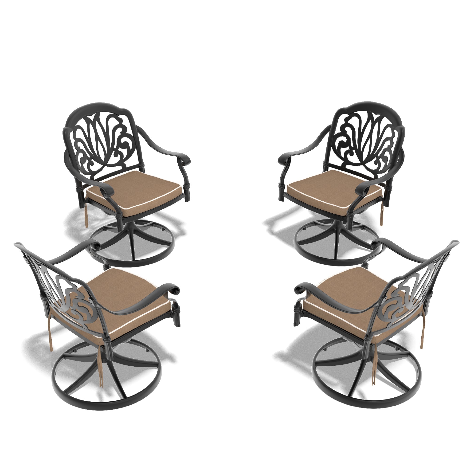 Upgrade your outdoor seating with this stylish and durable cast aluminum swivel chair set. Designed for comfort and built to last, each chair features a powder-coated black frame and supportive brown cushions, making it an ideal choice for patios, decks, and poolside lounges. The swivel mechanism and ergonomic armrests provide smooth movement and relaxation, while weather-resistant materials ensure long-lasting use with minimal maintenance.