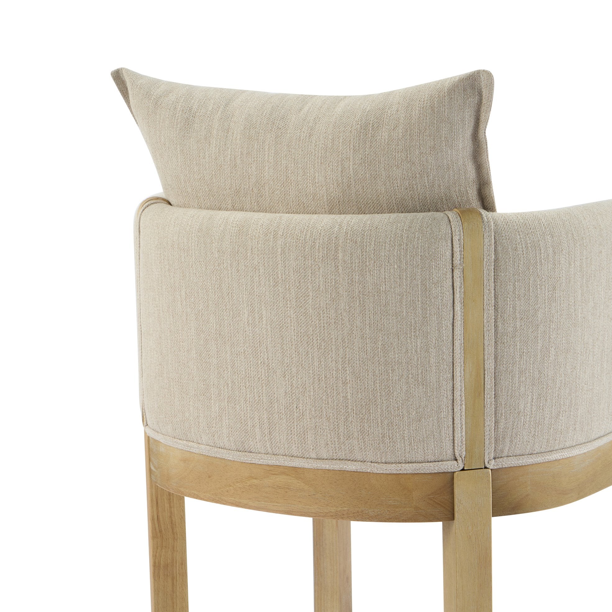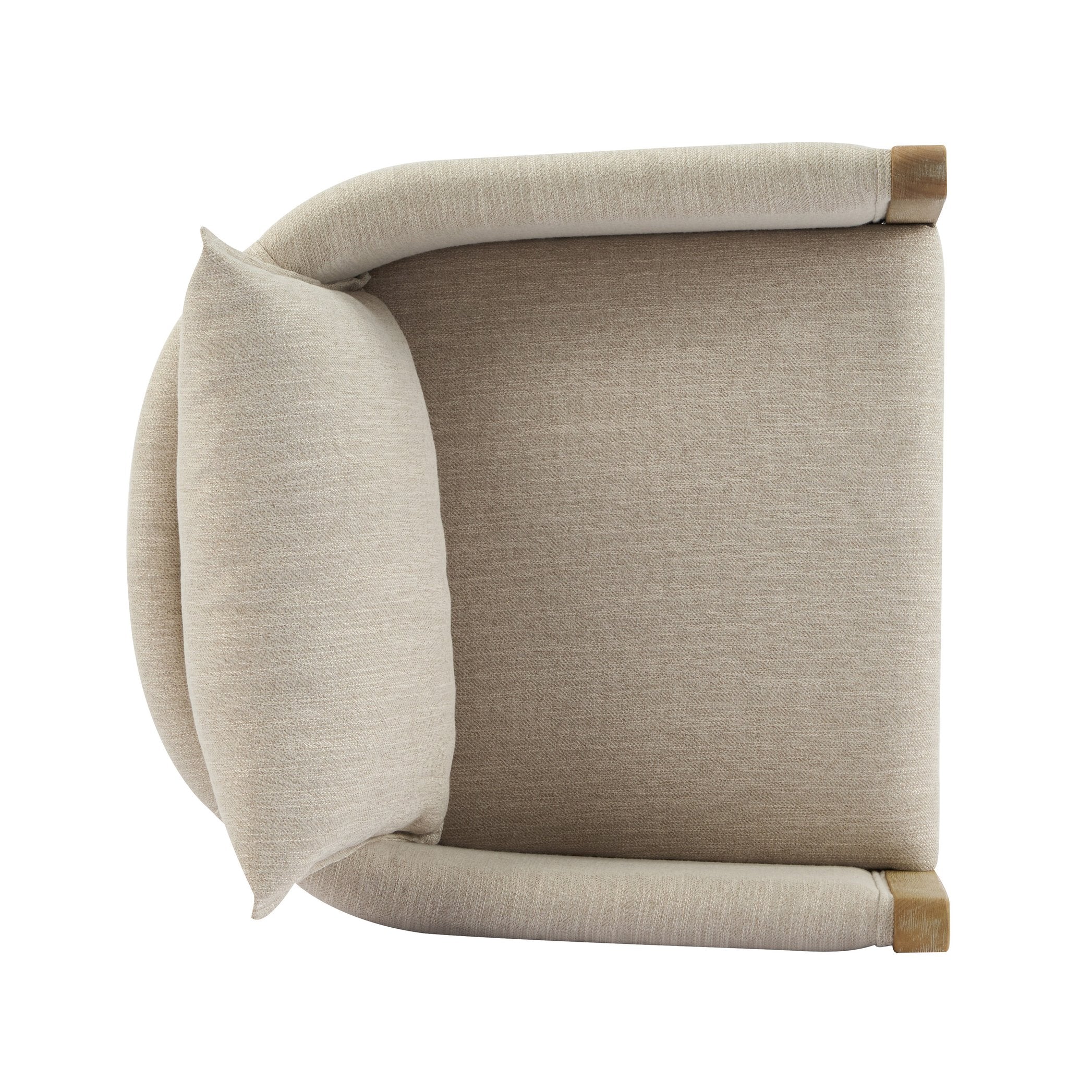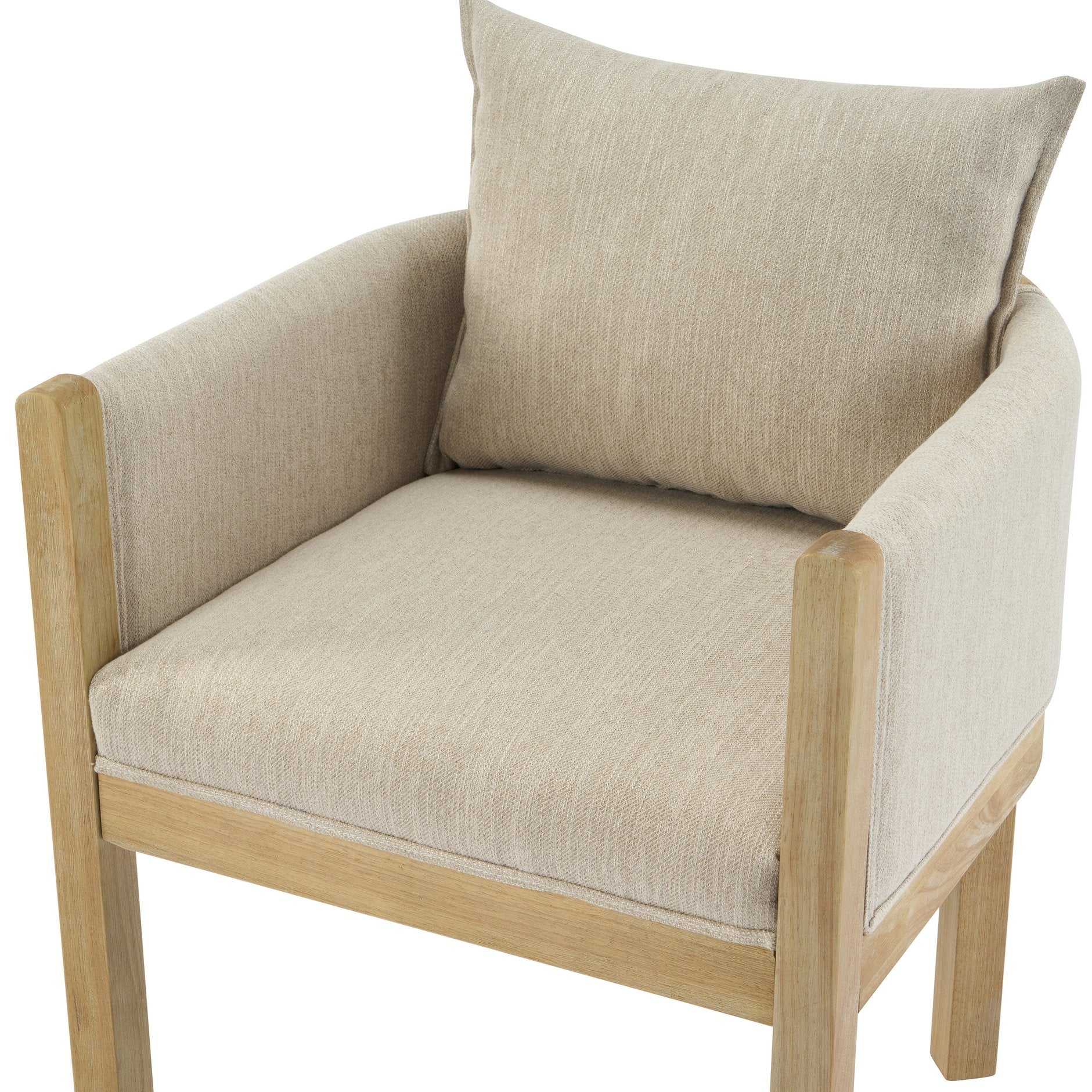 - Beige linen armchair with natural rubber wood frame for a warm, organic touch.