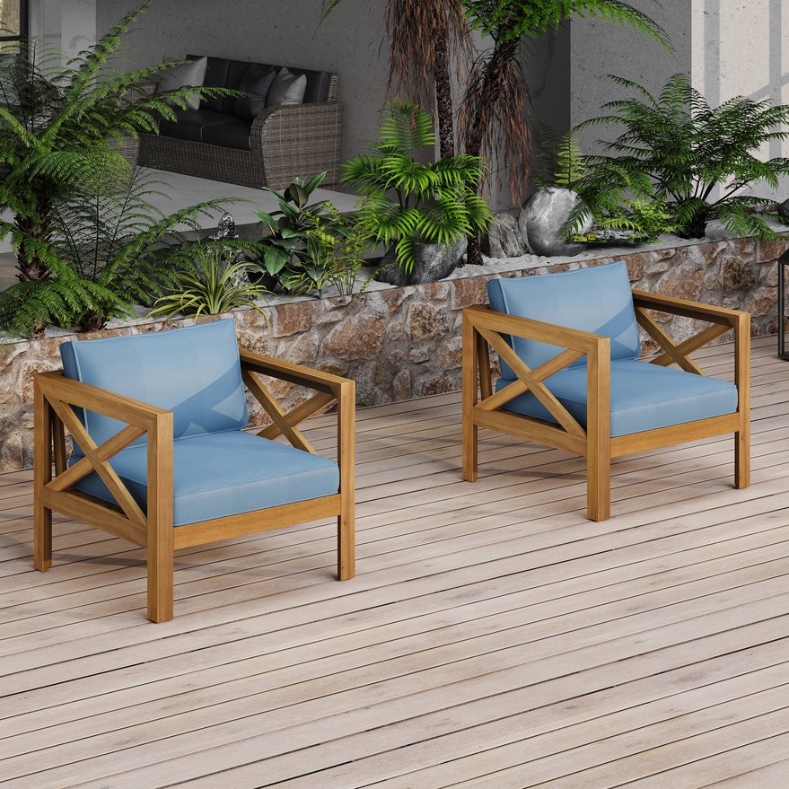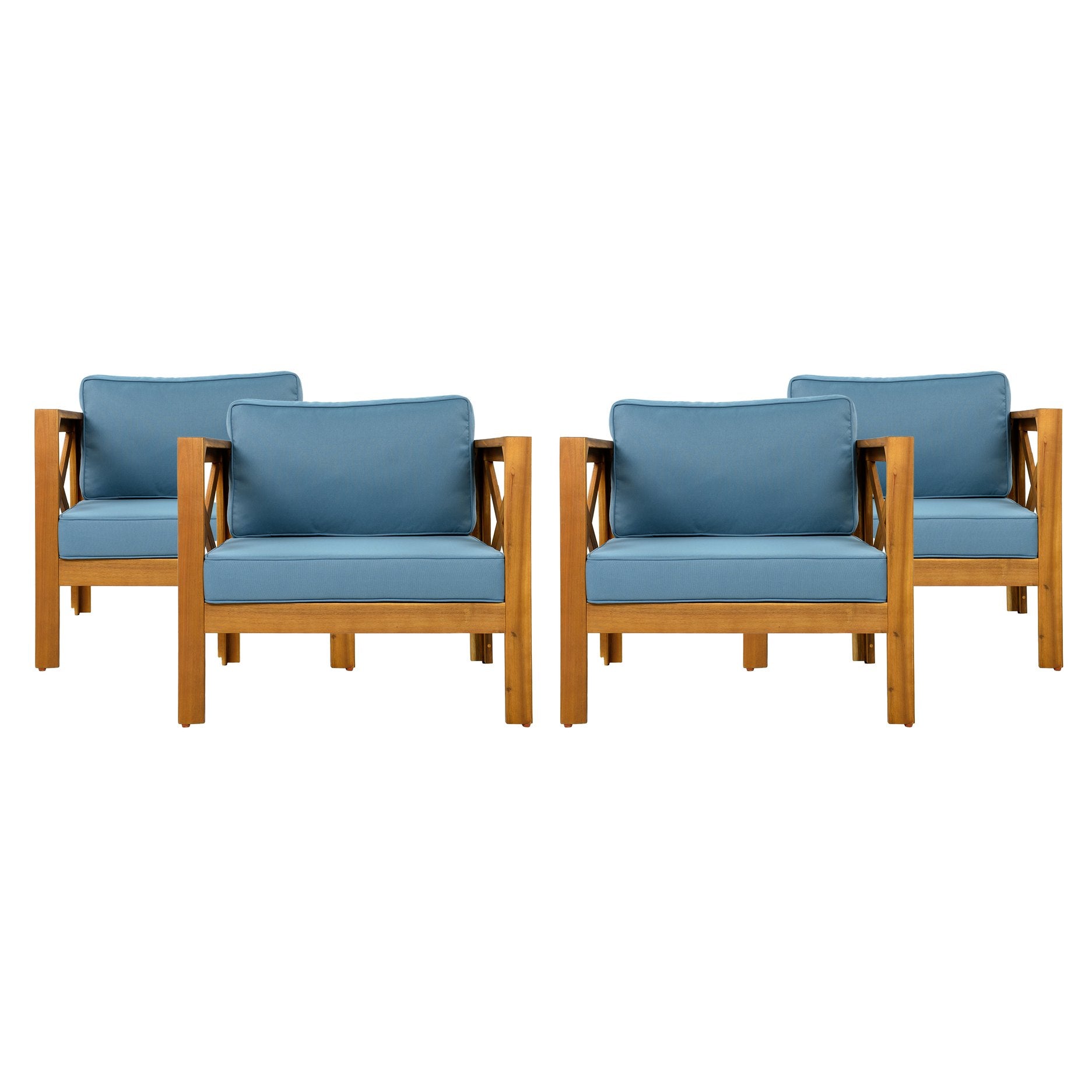 Bring comfort and timeless style to your outdoor living area with this set of four Acacia wood club chairs, thoughtfully crafted for durability, weather resistance, and relaxed conversation. Each chair pairs a warm teak finish with a supportive, water-resistant blue cushion to create an inviting seating arrangement that complements patios, decks, and garden nooks. Designed for easy assembly and low-maintenance care, this conversation set balances elegant aesthetics with practical outdoor performance.