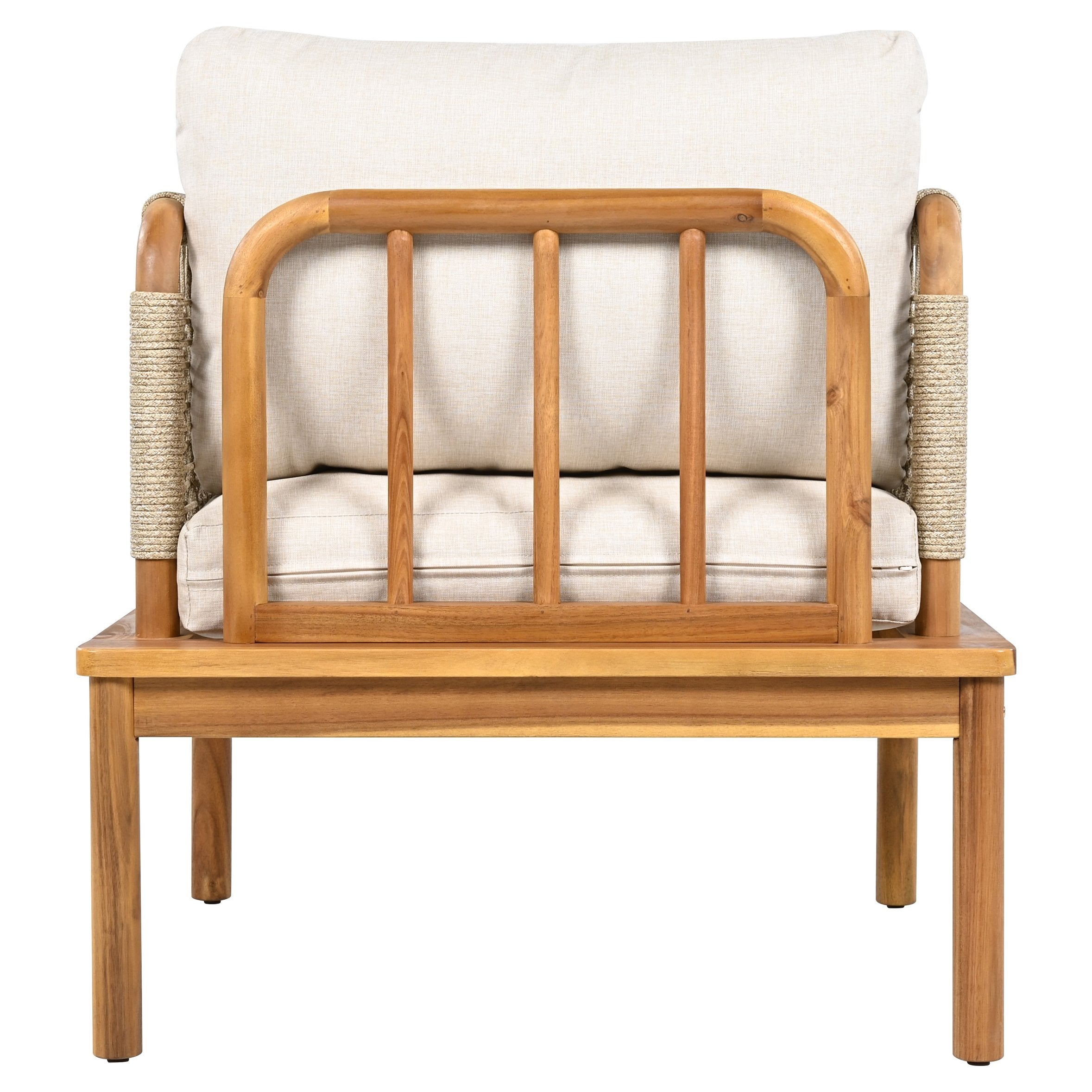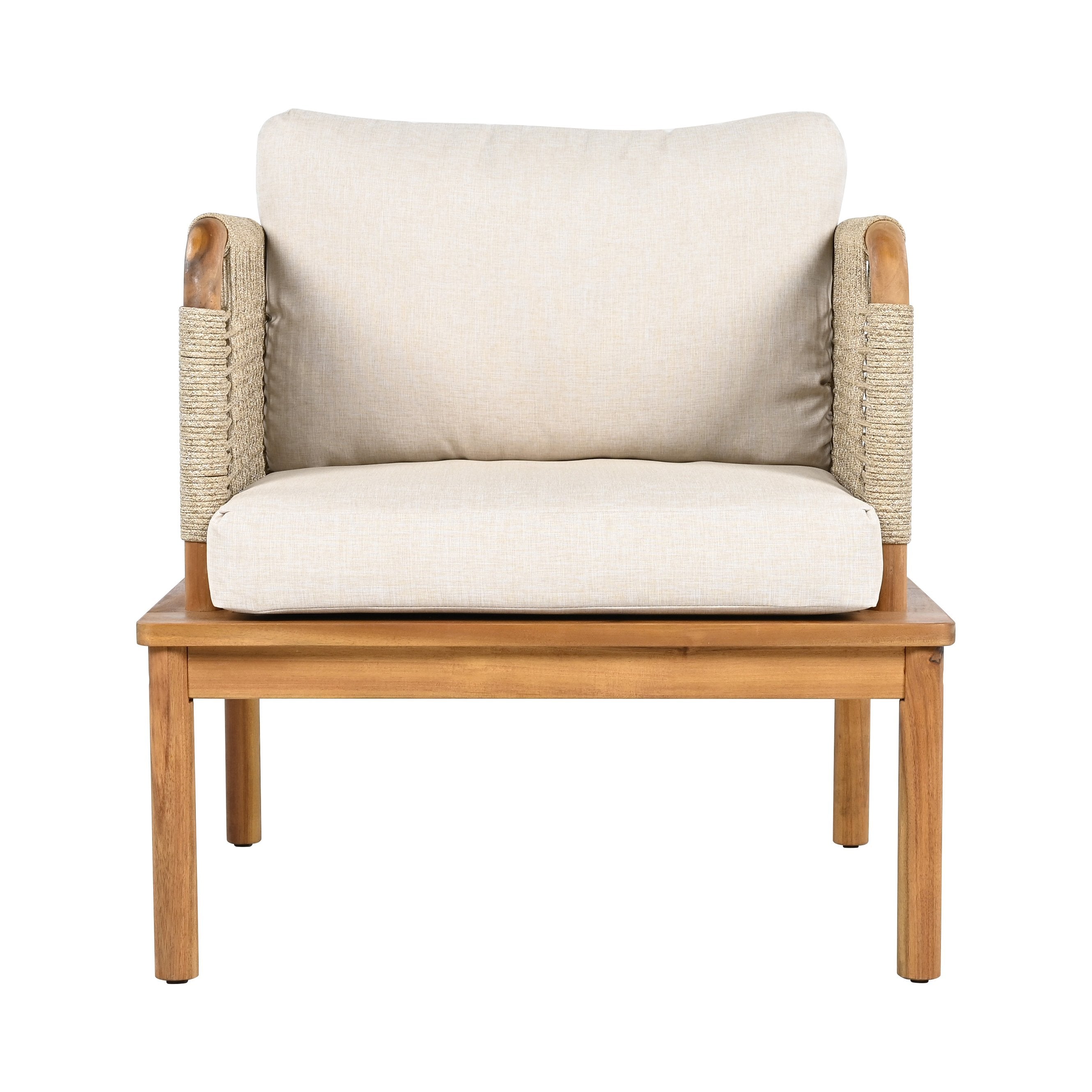 Bring relaxed, modern comfort to your outdoor living space with this single acacia wood and rope club chair. Designed for durability and style, it pairs a sturdy hardwood frame with a handwoven rope exterior and water-repellent cushions for all-season use. The chair’s generous proportions and supportive back make it ideal for lounging on a patio, deck, or garden nook.