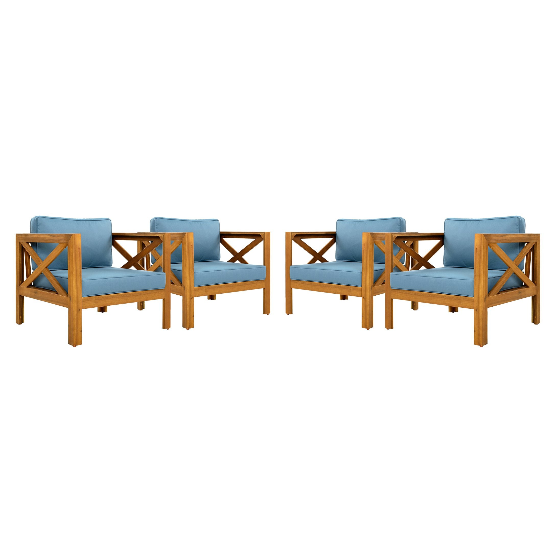 Transform your outdoor space into a comfortable and stylish retreat with this Acacia wood club chair set. Expertly crafted with a teak finish and water-resistant blue cushions, these chairs blend durability, ergonomic comfort, and timeless design to create an inviting conversation set for patios, decks, and gardens. Ideal for casual gatherings or quiet mornings with a cup of coffee, the set of two offers reliable performance and low-maintenance enjoyment season after season.