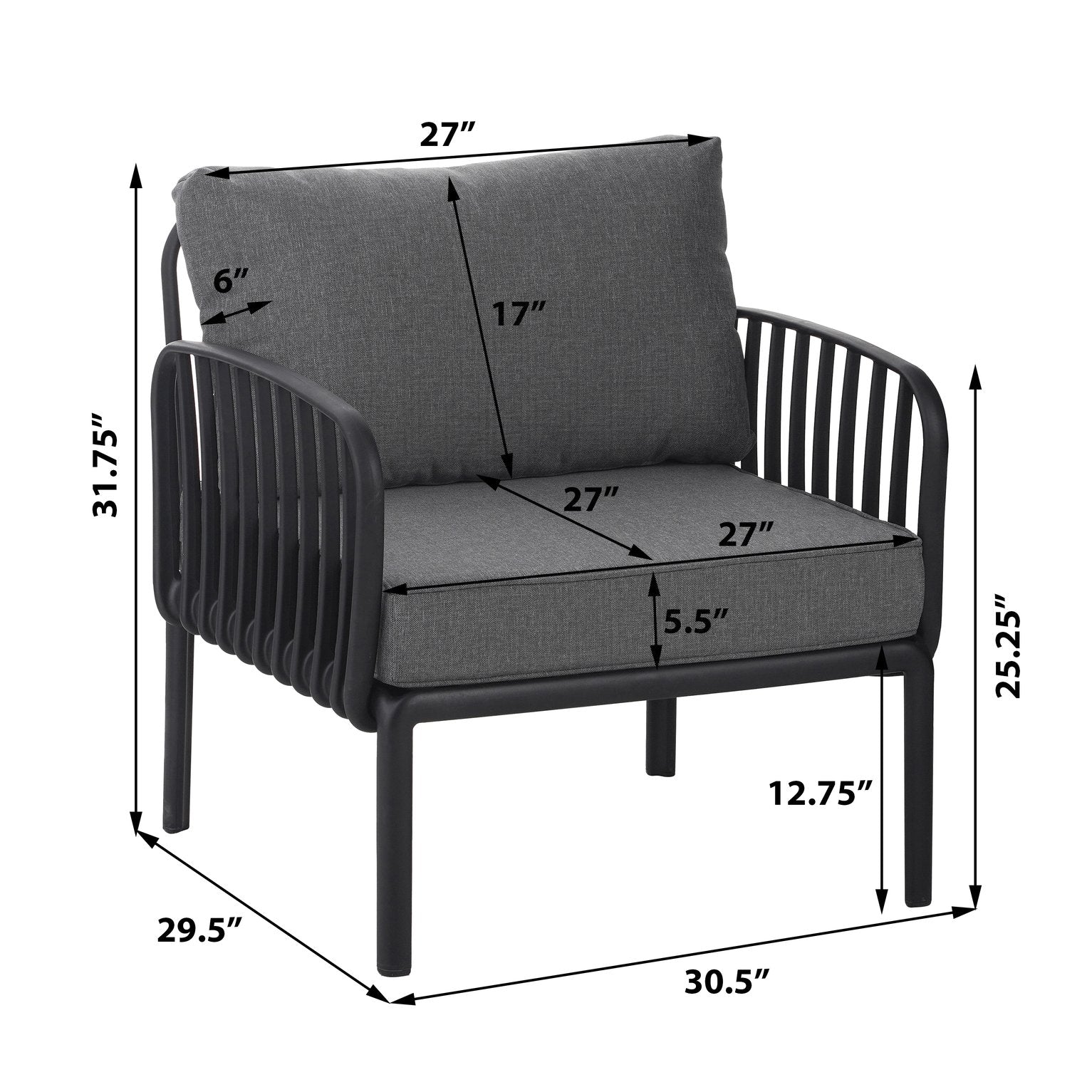 - Cushion sizes: Back cushion: 27" x 17" x 6" (L x W x Thickness); Seat cushion: 27" x 27" x 5.5" (L x W x Thickness)