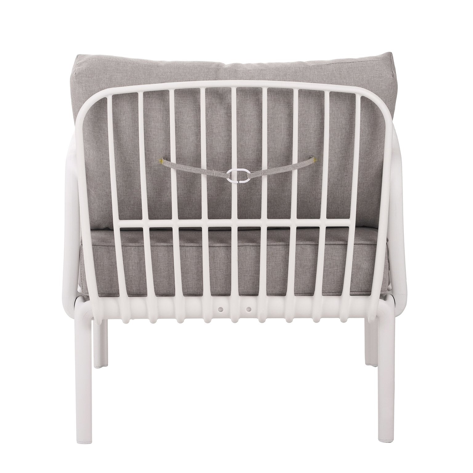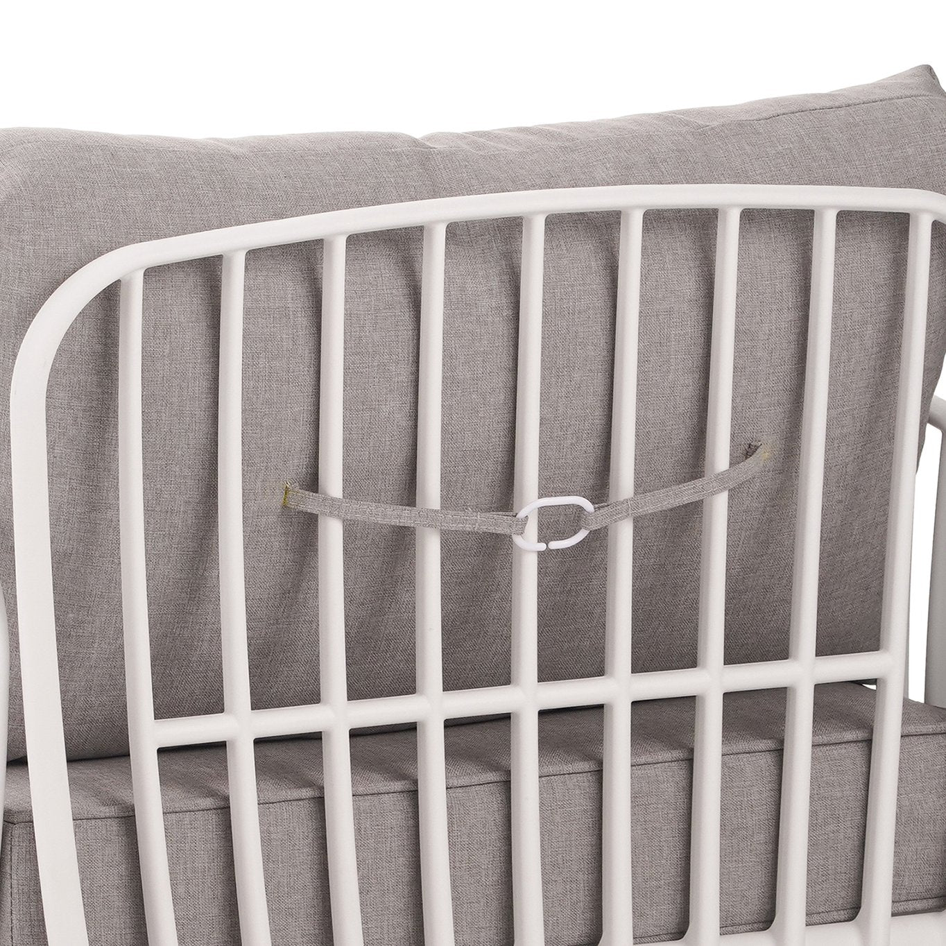 - Style & finish: Modern/classic silhouette in white frame with solid light-gray cushions to complement a variety of outdoor décors