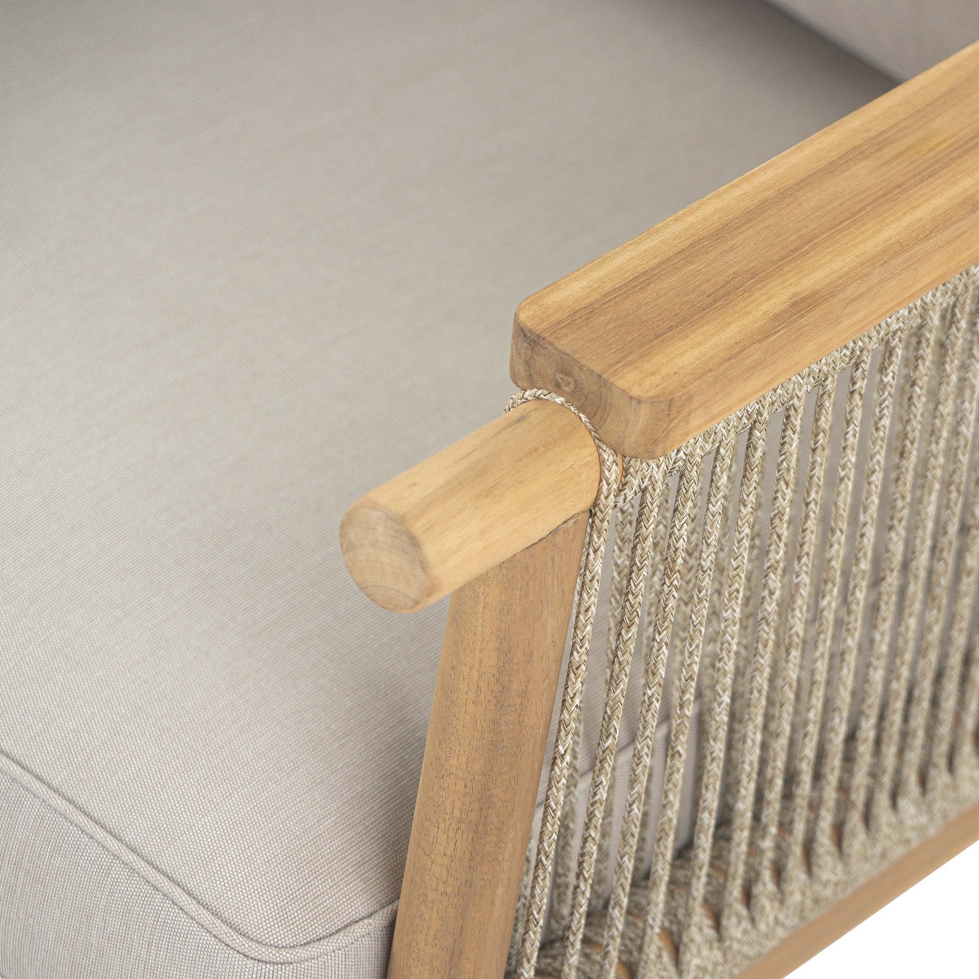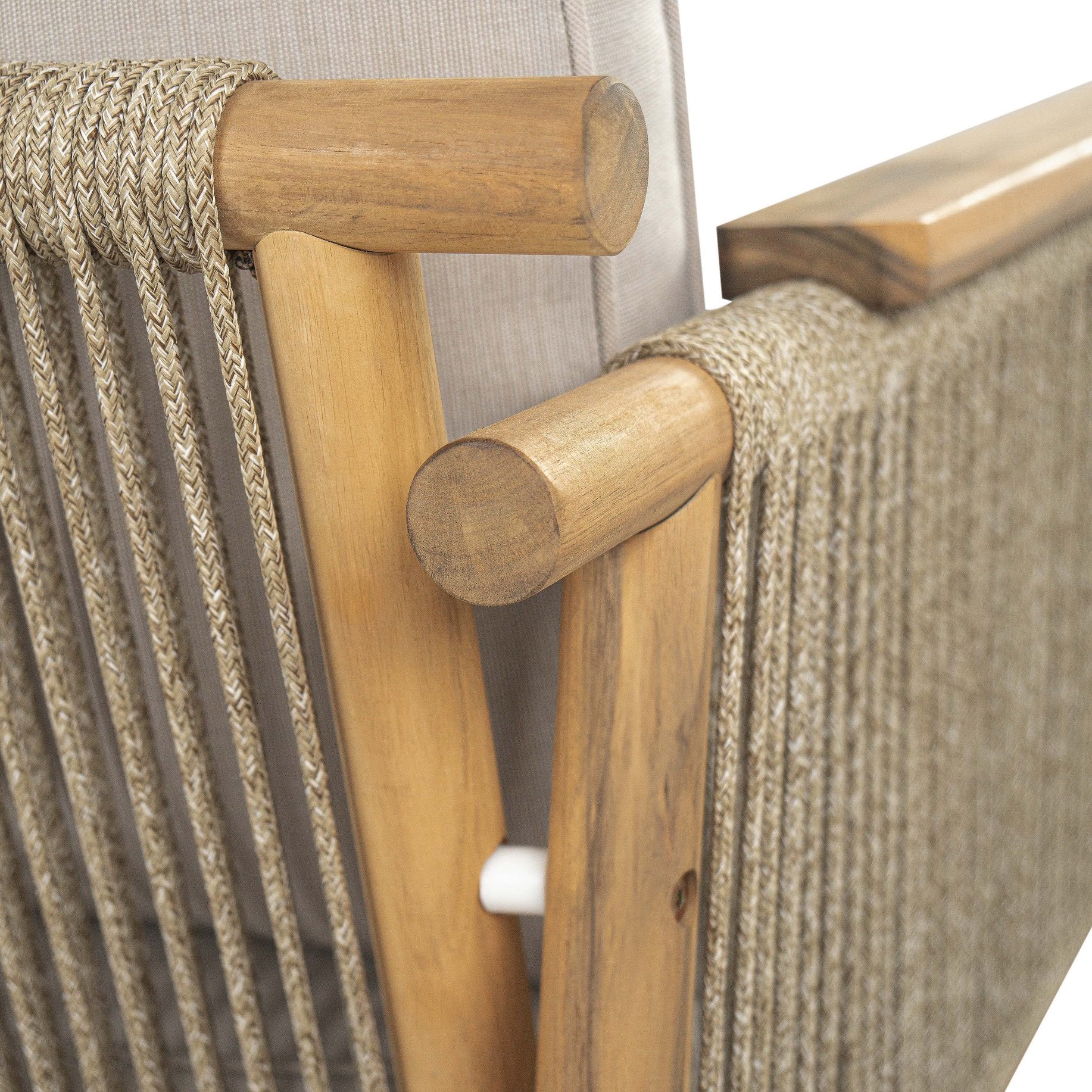 - Stylish Rope Detailing: Hand-applied rope wraps the backrest and armrests for a breezy, modern aesthetic and comfortable support; designed to complement the wood frame while enhancing airflow.