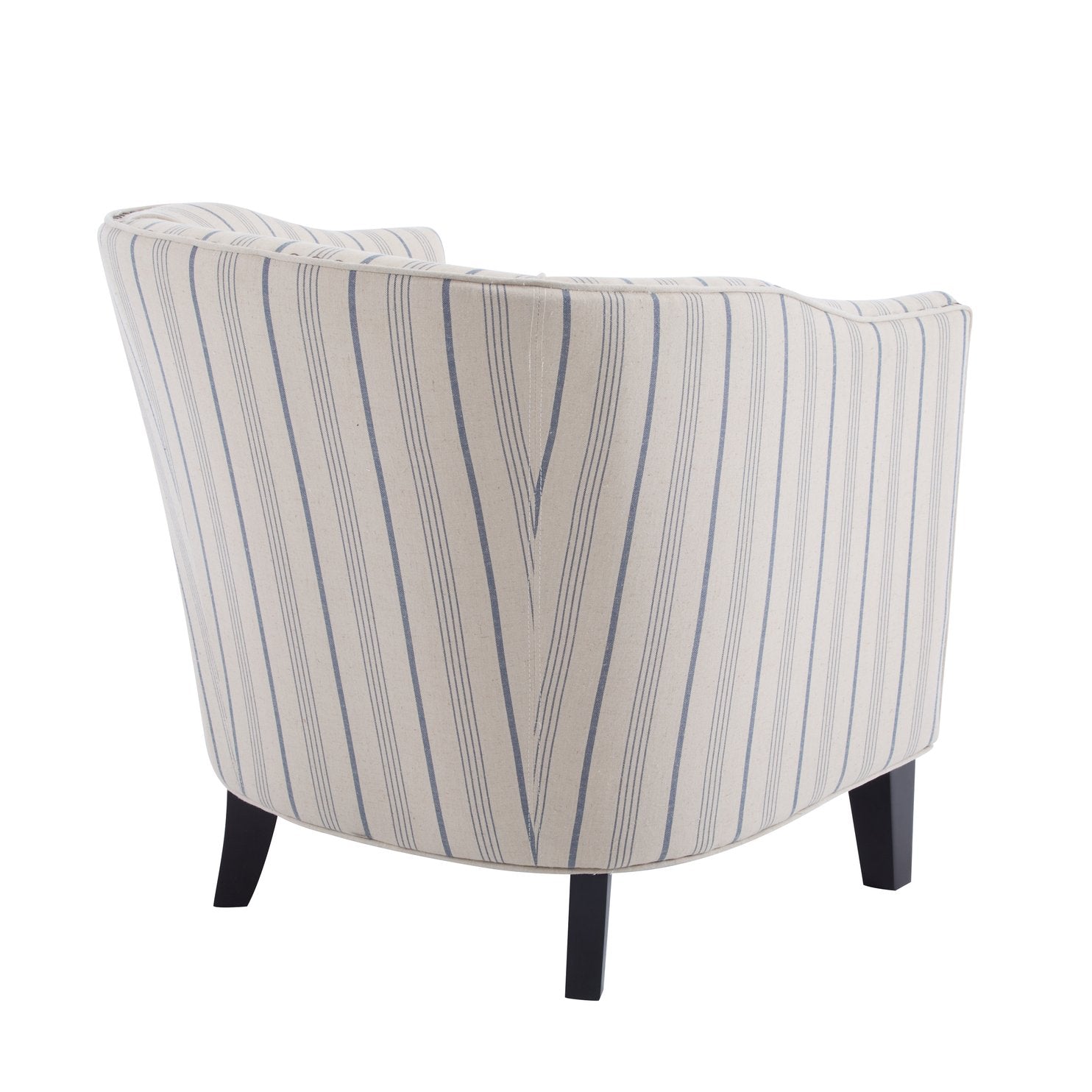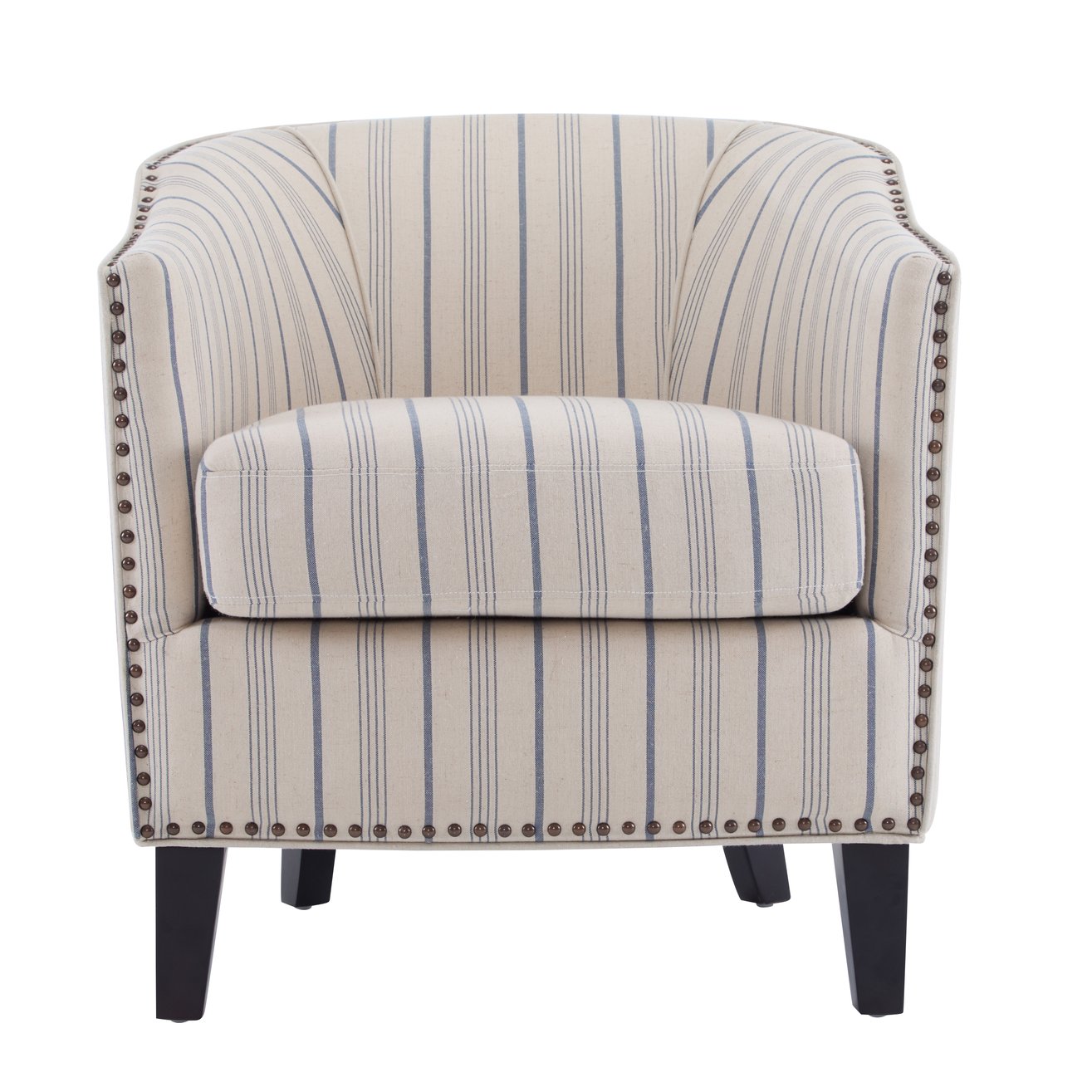 Bring classic club-chair comfort and tailored style into your living space with this upholstered barrel chair. Its striped fabric, studded accents, and warm wood legs create a refined yet approachable look that suits traditional, transitional, and contemporary interiors. Plush cushioning and supportive construction make it an inviting spot for reading, relaxing, or entertaining.