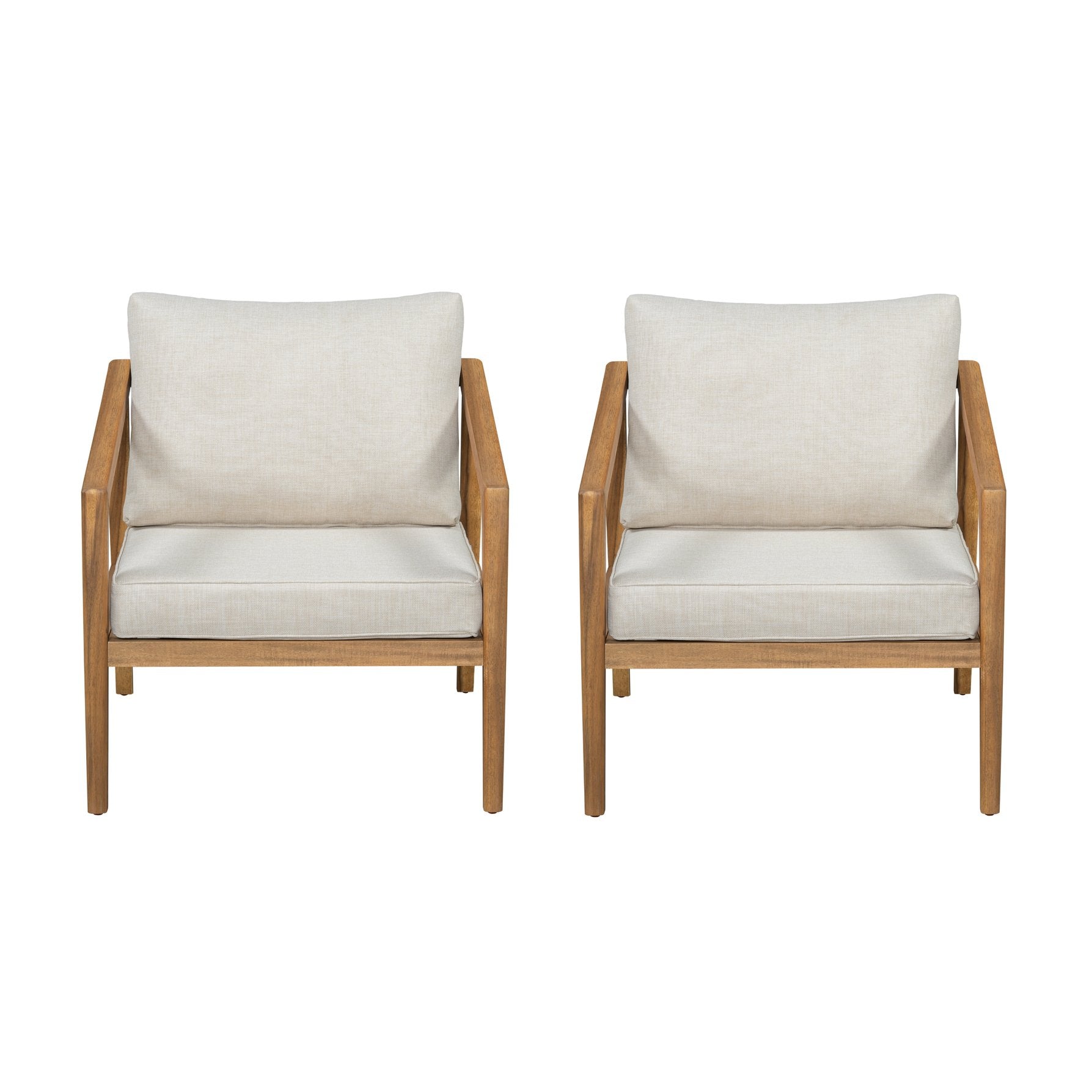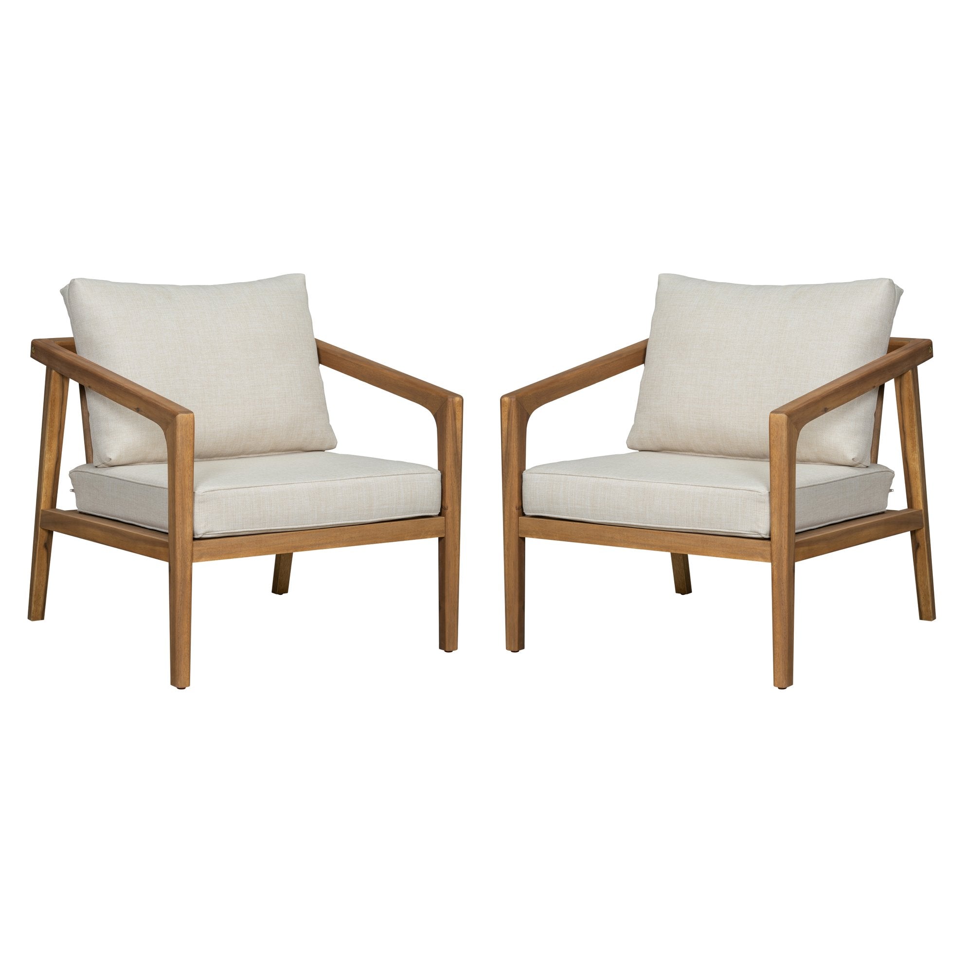 - Take your outdoor experience to the next level. Boasting rich acacia wood frames a, our set of two club chairs is both practical and pleasing. Its slat-paneled seating brings a classic feel to your outdoor space, while its cushions invite plenty of comforts so you can relax. Use this versatile chair set to style your backyard into one that you'll love.