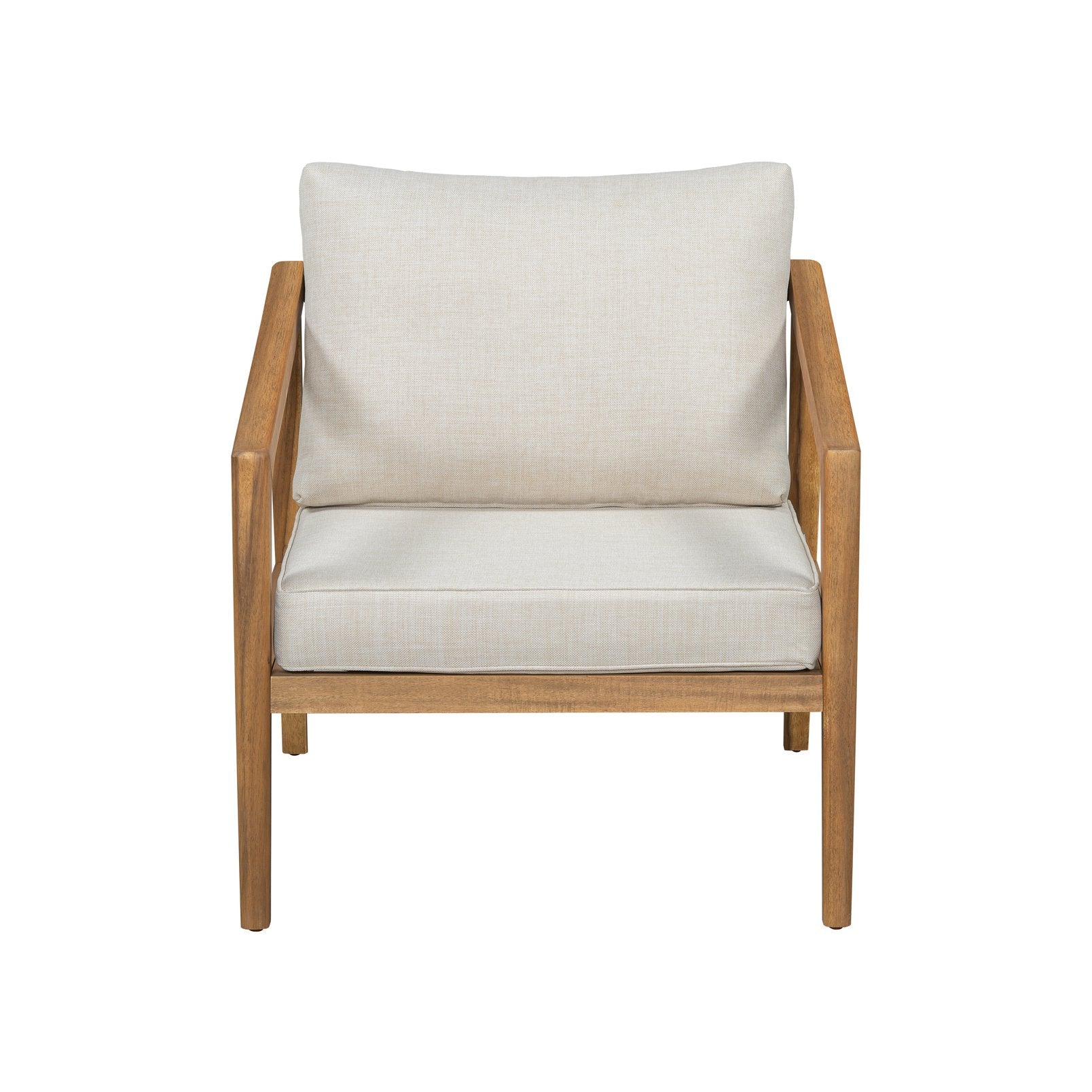 Upgrade your outdoor seating with this elegant pair of acacia wood club chairs, thoughtfully designed for comfort, durability, and style. The warm teak finish and neutral beige cushions create a timeless look that complements patios, decks, and garden lounges. Built from sturdy acacia hardwood and paired with removable cushions, this set balances solid construction with cozy relaxation for everyday use or casual entertaining.