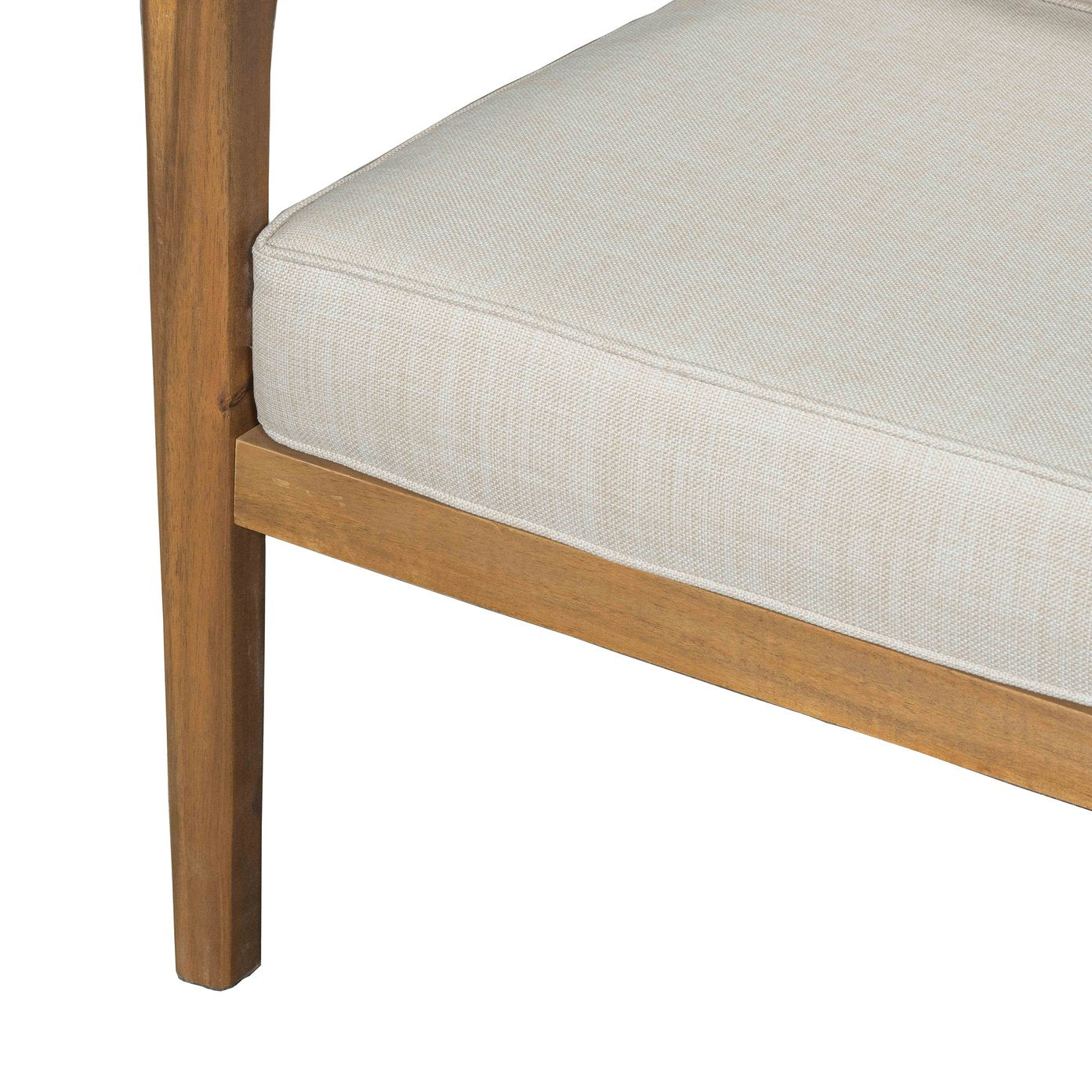 - Set Includes: Two (2) acacia wood club chairs with removable beige cushions.
