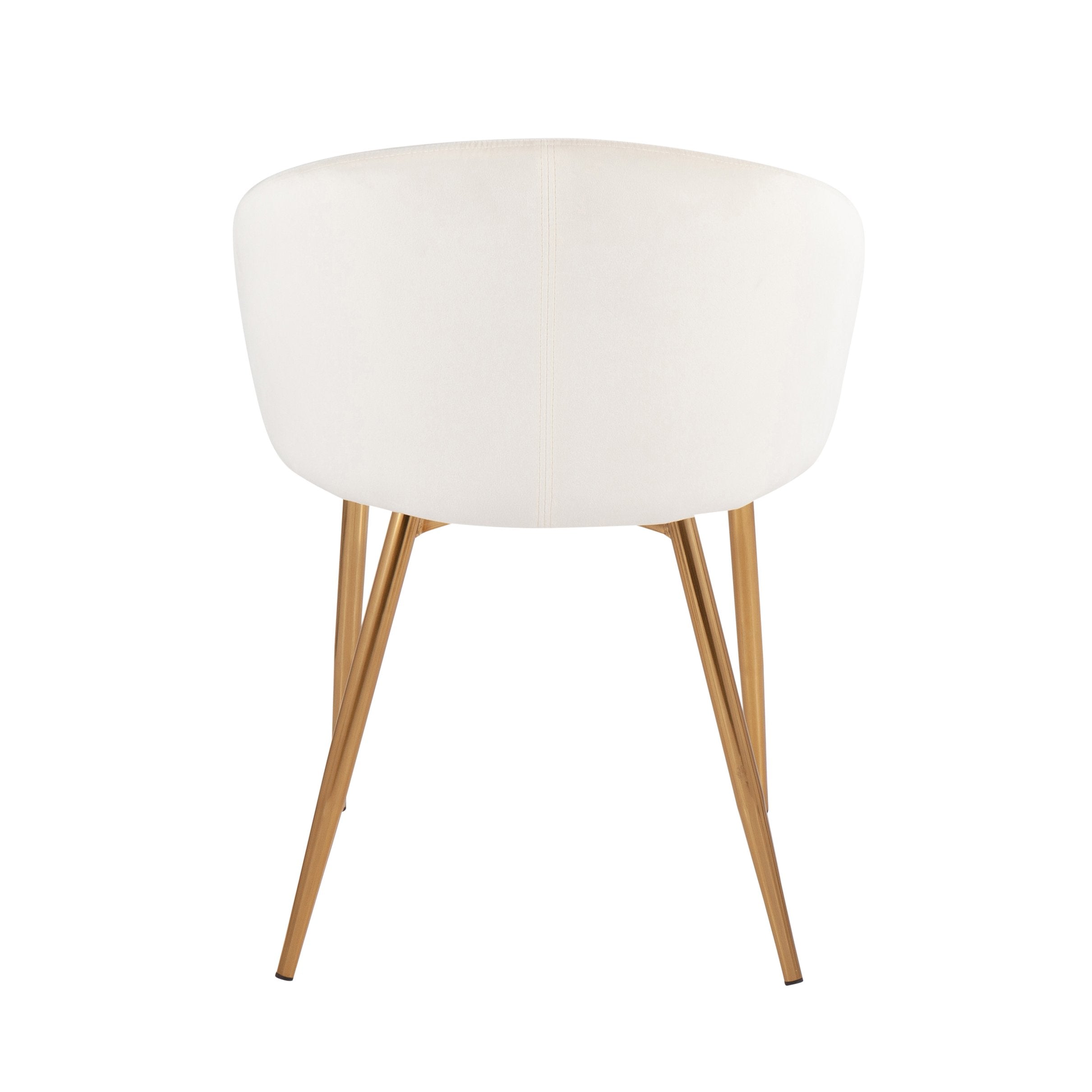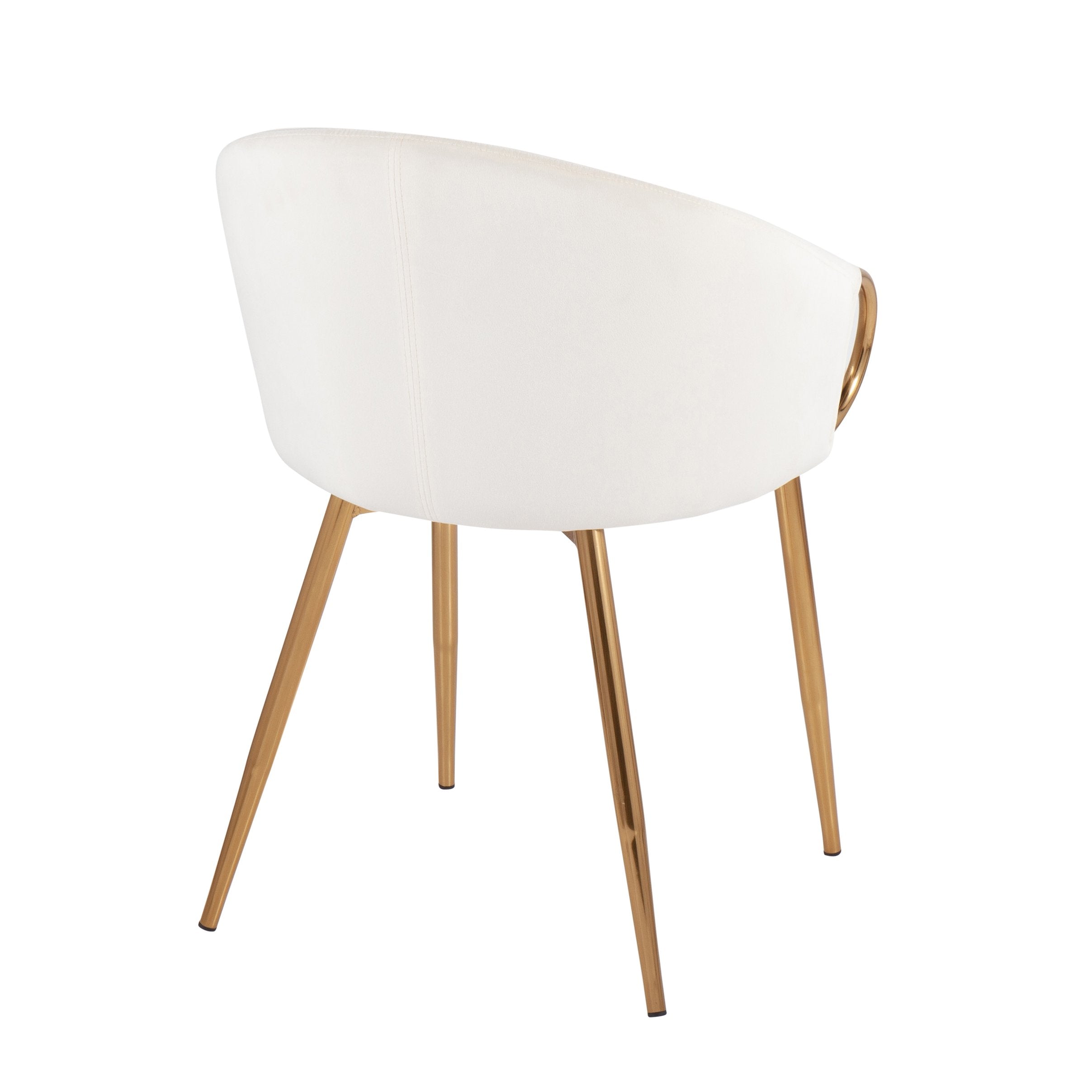 Elevate your dining or seating area with the Claire chair — a contemporary-glam accent that blends plush comfort and luminous metallic style. Upholstered in cream velvet with a warm gold metal frame, this set of two chairs offers an inviting silhouette with a rounded low backrest and supportive padded seat, making them ideal for modern dining rooms, vanity areas, or stylish office seating.