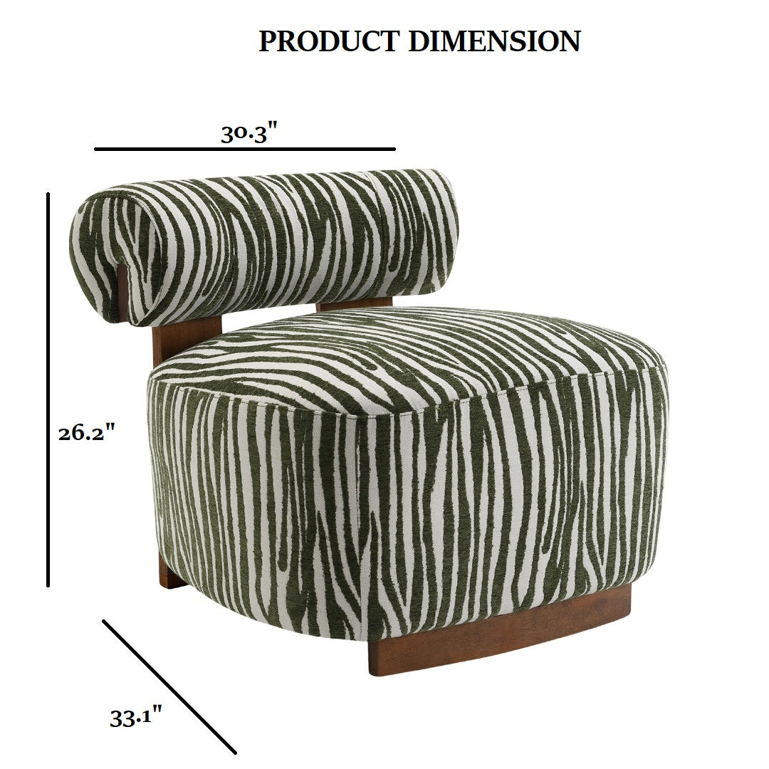 Add a touch of contemporary flair to your living space with this stylish green accent chair. Its cylindrical backrest, zebra-striped fabric, and warm wood accents create a striking yet comfortable focal point for primary living rooms, reading nooks, or guest seating. The chair balances firm high-density foam support with exposed wooden legs for lasting comfort and modern appeal.
