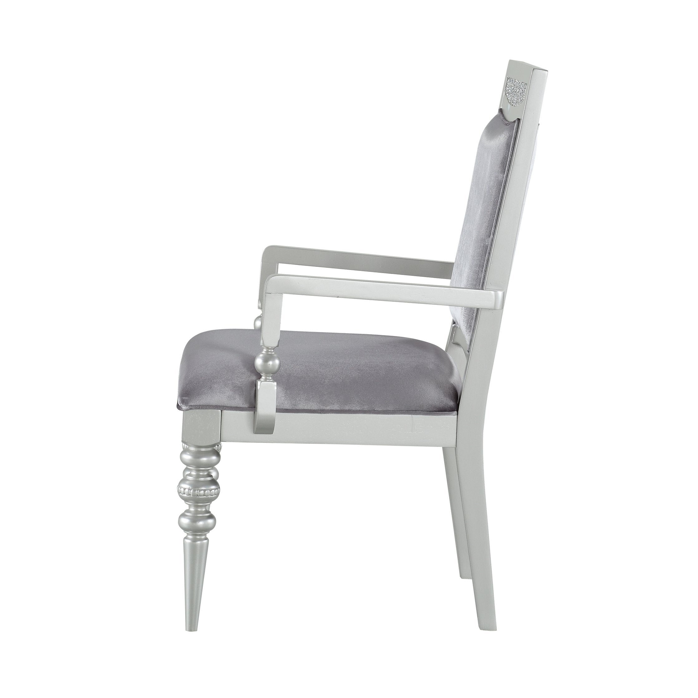 Elevate your living space with a pair of sophisticated upholstered arm chairs that blend plush comfort and glamorous detail. These chairs feature soft grey fabric seating, a luminous platinum finish, and sparkling rhinestone accents for a refined, statement-making look. Built on a stable wooden frame with turned legs, they offer both style and long-lasting support—ideal for formal living rooms, master suites, or chic lounge areas.
