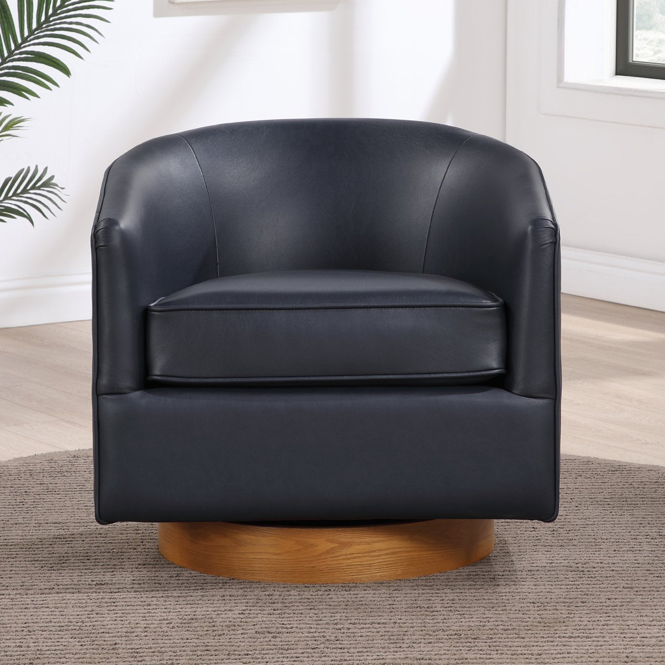 Give your living space a modern, comfortable update with the Maisy swivel barrel chair. Upholstered in rich midnight blue faux leather with a warm wood-finish swivel base, this compact accent chair combines supportive construction and easy, no-assembly convenience—ideal for living rooms, bedrooms, reading nooks, or home offices.
