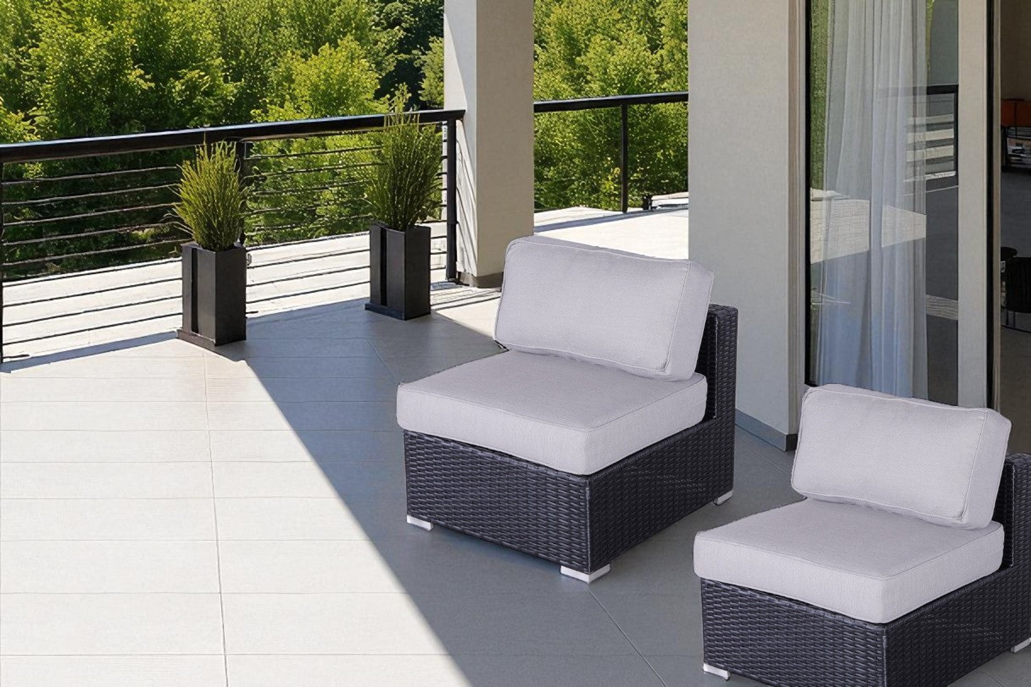 Bring modern resort-style comfort to your patio with this pair of armless outdoor chairs. Handwoven high-density all-weather wicker over a rust-resistant aluminum frame gives a refined, low-maintenance look that stands up to sun, rain, and humidity. Thick, removable zippered cushions deliver plush seating and easy cleaning, while the compact armless profile makes these chairs ideal for modular arrangements or as standalone accent seating.