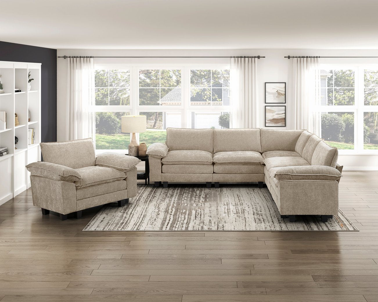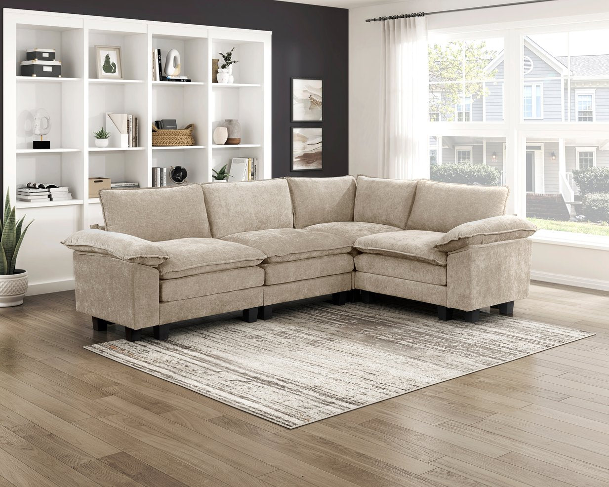 - Upholstery: Taupe chenille fabric with a soft, textured hand for a sophisticated look and cozy feel.