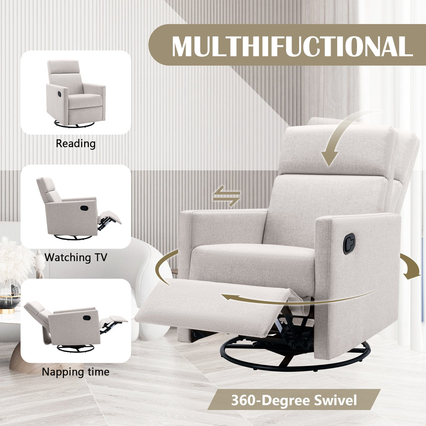 - MULTHIFUCTIONAL:This contemporary swivel push-back recliner is able to tilt from 95° to 160°, providing you with the best angle of comfort, not only for working and reading, but also for napping and sleeping. The recliner supports 360° rotating gliding ability to provide you with fun in your life.