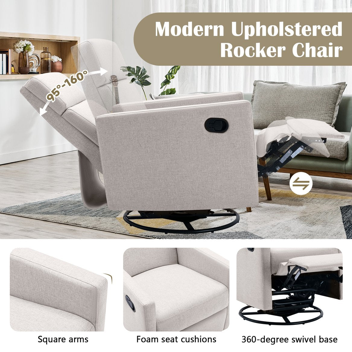 Sink into soothing comfort with this modern upholstered nursery rocker — a chic, supportive seating solution designed for late-night feeding, quiet reading, or simply relaxing. Combining a plush pillow back, smooth swivel-glide motion, and a whisper-quiet reclining mechanism, this chair offers ergonomic support for parents while complementing contemporary nursery decor. Built with durable materials and a streamlined silhouette, it’s both a stylish and practical choice for everyday family use.