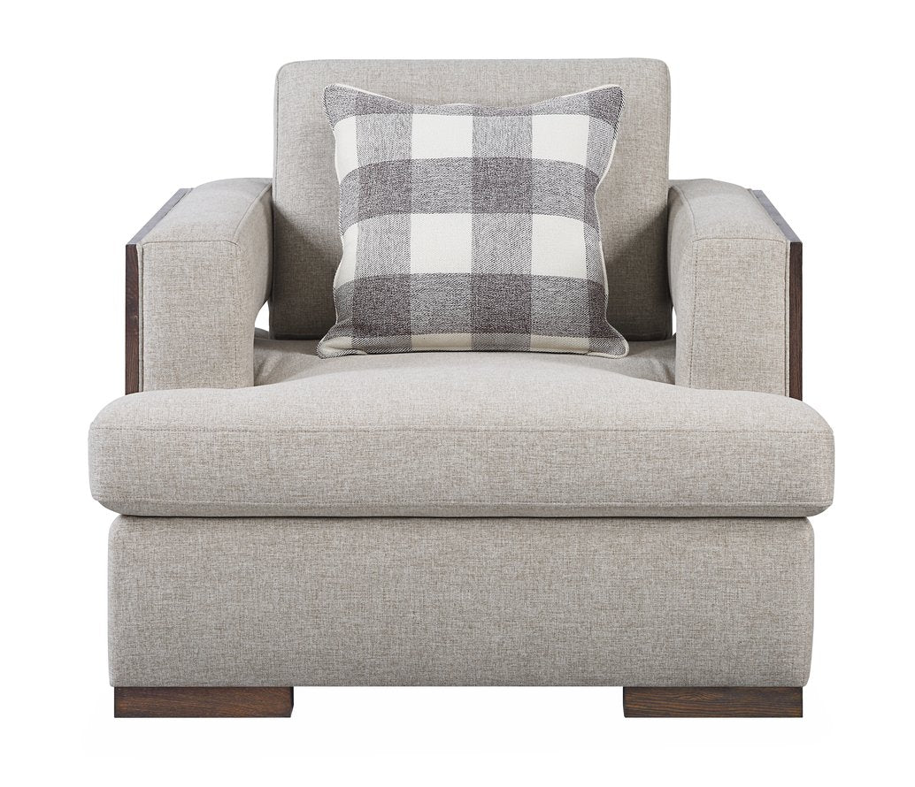- The track armrests, framed with elegant wood trim, add a touch of sophistication, while the wide block legs in a walnut finish lend a sense of timeless appeal.