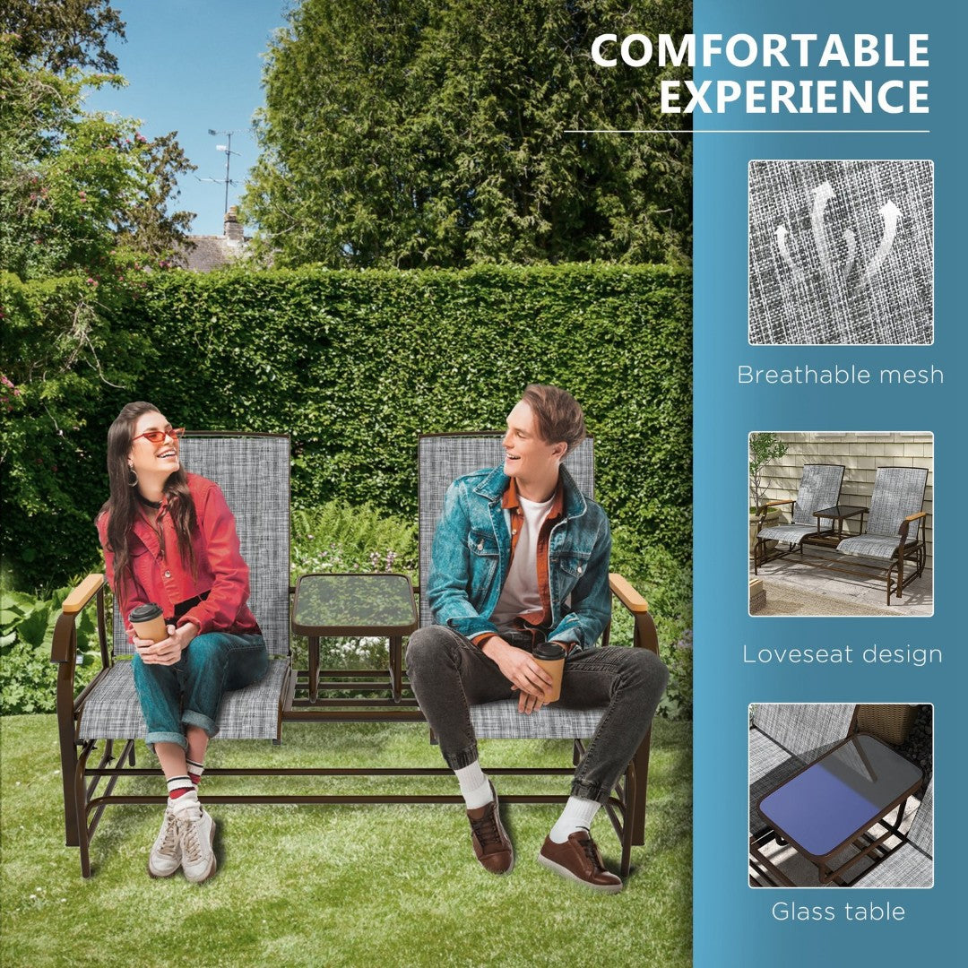 Enjoy relaxed, shared moments outdoors with this comfortable two-person glider loveseat—designed for smooth motion, breathable seating, and a convenient center table for drinks or snacks. Built on a durable powder-coated steel frame with quick-drying mesh seats and a tempered-glass table, it’s ideal for patios, porches, gardens, and backyards.