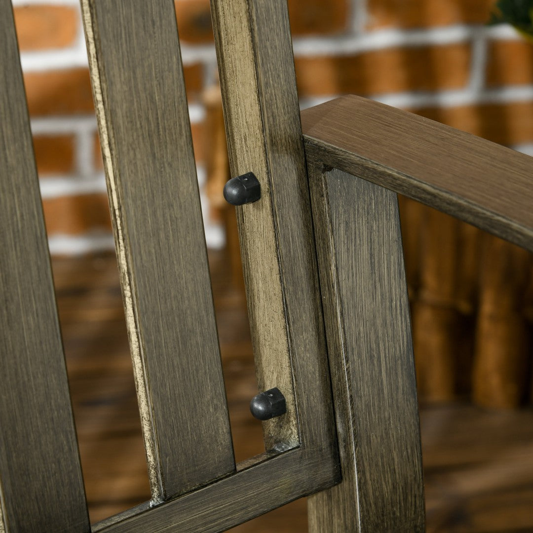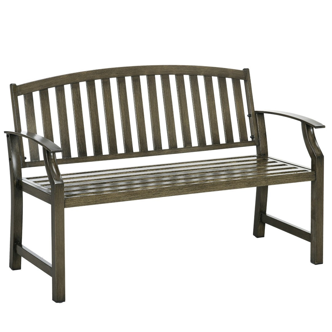 Enjoy relaxed outdoor seating with timeless park-bench styling and durable construction. This two-seat metal bench combines a wood-look slatted frame, comfortable ergonomics, and weather-resistant finishes to create an attractive, low-maintenance accent for your patio, porch, deck, or garden.
