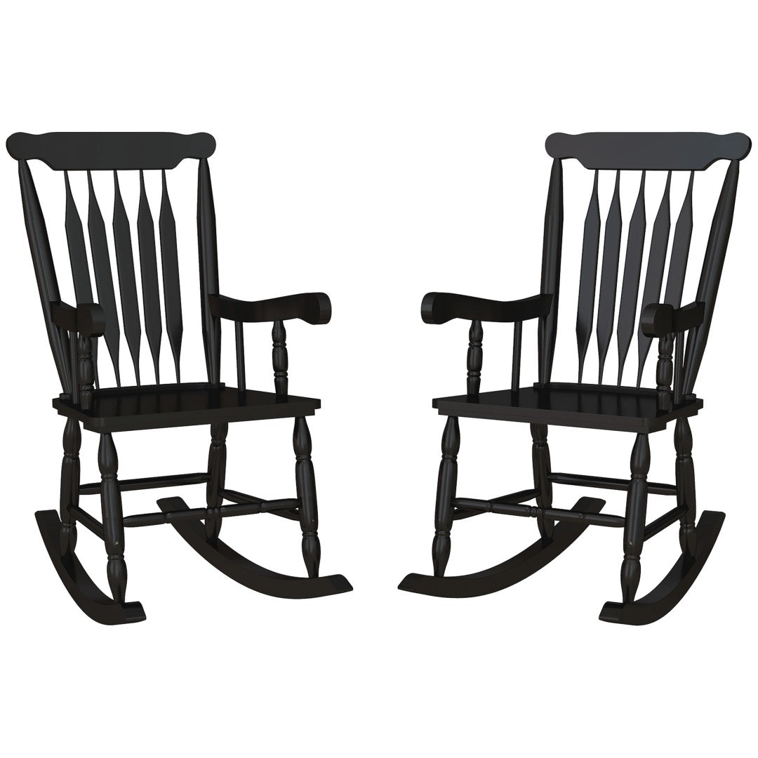 Enjoy timeless comfort and classic style on your porch, patio, or balcony with this set of two wooden rocking chairs. Designed for smooth motion and durable outdoor use, each chair offers a wide, supportive seat and high back for relaxing afternoons or cool evenings. Finished in black, these rockers blend traditional charm with weather-resistant construction to complement many outdoor settings.
