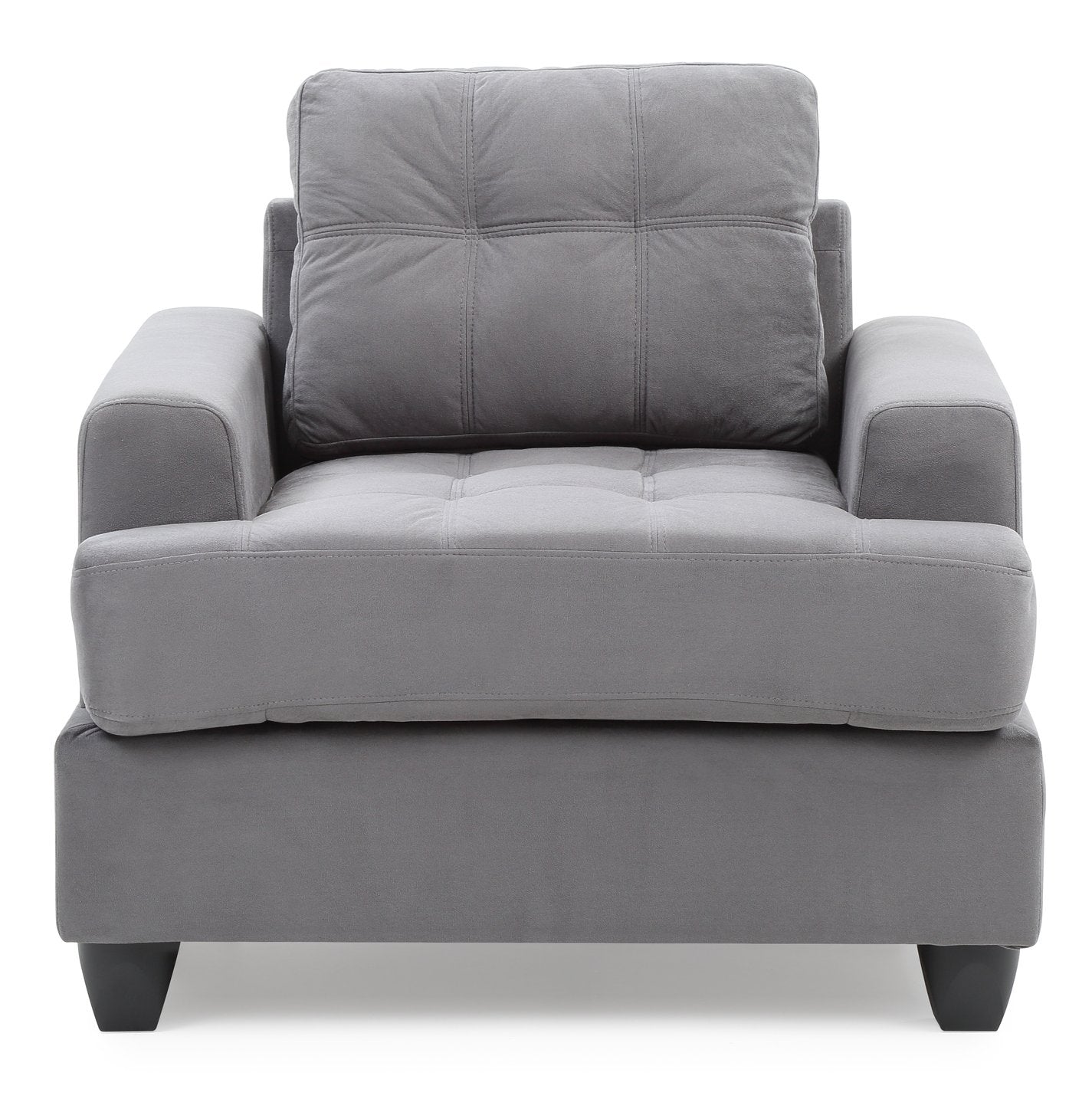 This sleek transitional gray accent chair combines contemporary lines with cozy microfiber upholstery to create a versatile seating piece ideal for living rooms, bedrooms, or reading nooks. Its compact footprint and supportive saddle arms make it comfortable for lounging while fitting easily into smaller spaces.