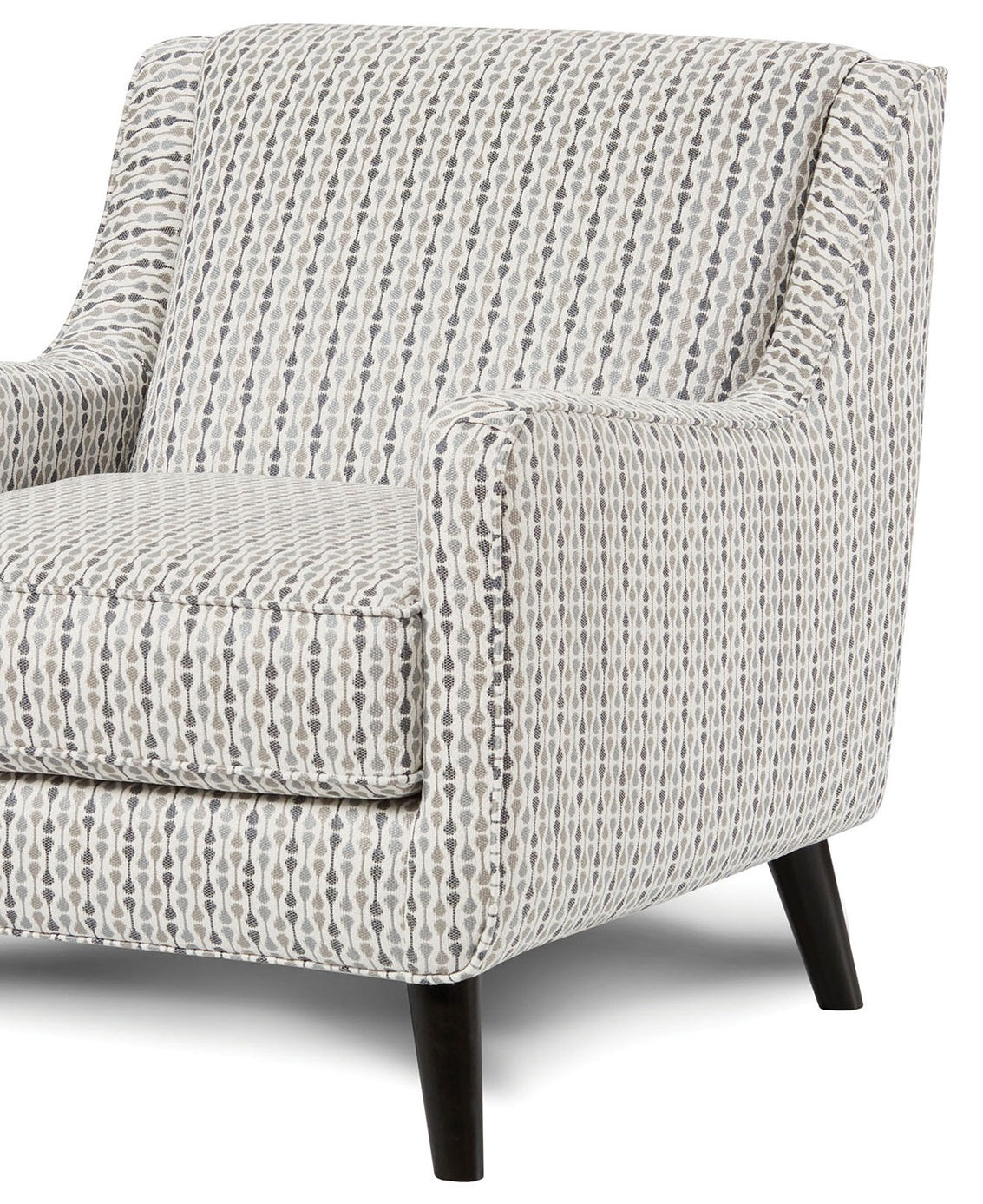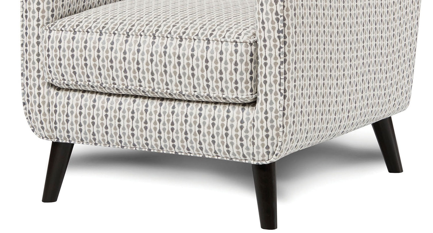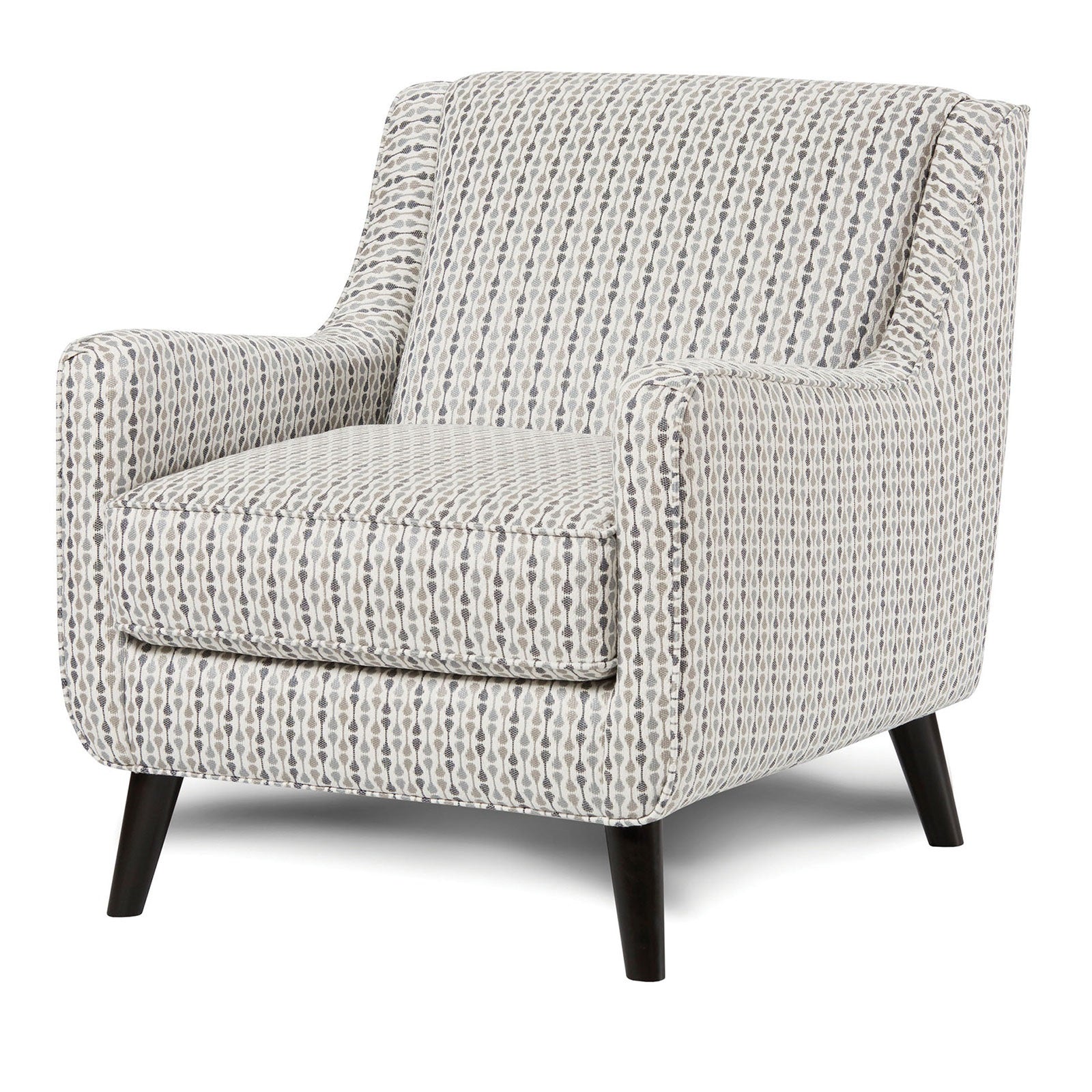 Bring a bold, contemporary accent to your living space with this upholstered accent chair. Its vintage pop-art inspired fabric combines flat-colored, repeated shapes for eye-catching visual texture, while the sloping track arms and tapered dark-stained block legs create a sleek, modern silhouette. Welt cord trim adds a subtle, tailored edge, making the chair both stylish and approachable for primary living areas, reading nooks, or guest seating.