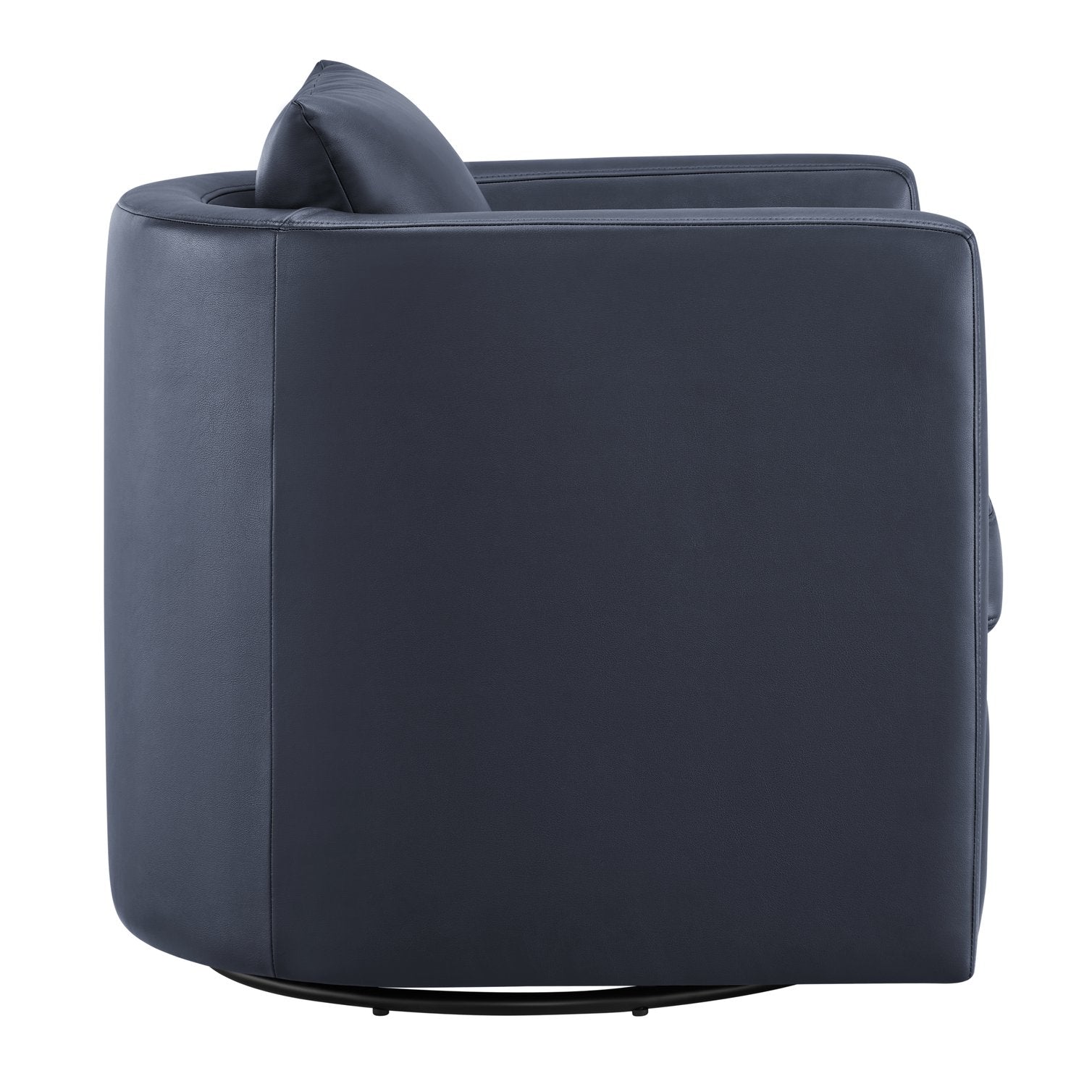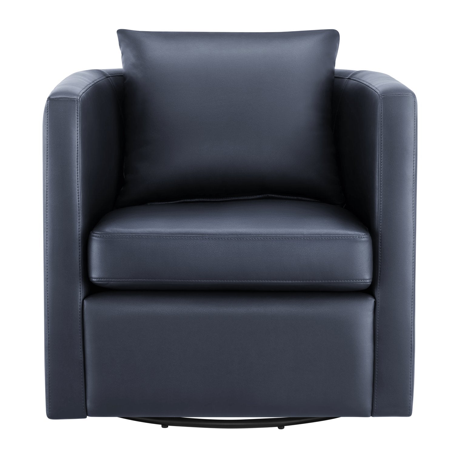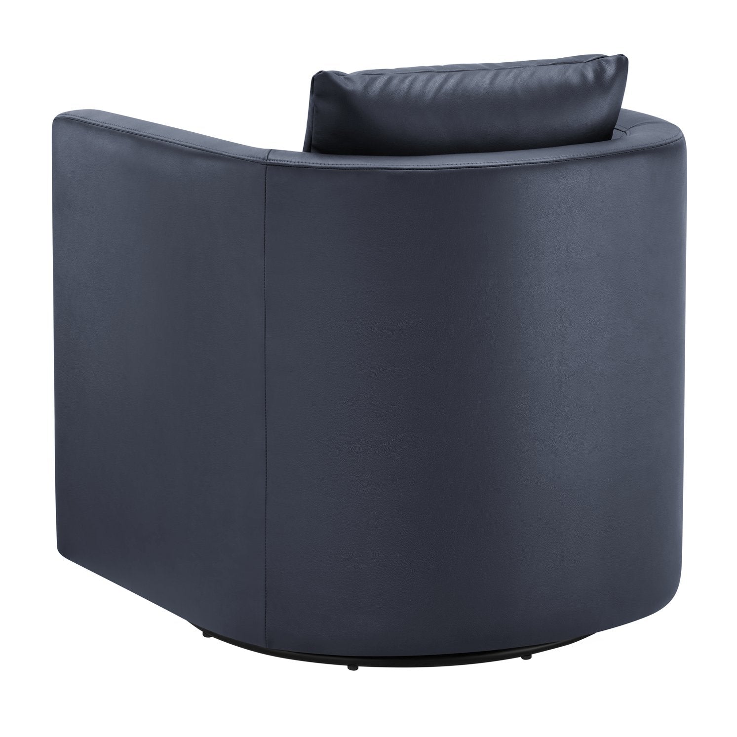 Elevate your living space with the Sutton Midnight Blue Swivel Barrel Chair — a stylish, comfortable accent chair designed for everyday living. Wrapped in durable, family- and pet-friendly midnight blue faux leather, this chair blends contemporary barrel styling with practical features like a plush pocket coil seat and a large supportive back pillow. Its 360-degree swivel and reversible cushions make it both functional and long-lasting, perfect for lounging, reading, or casual conversation.