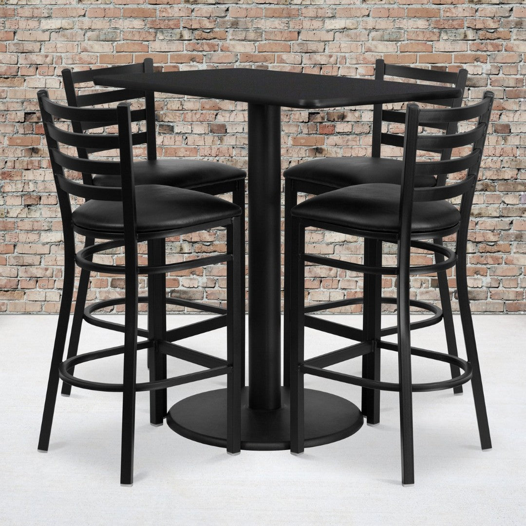 Elevate your dining or hospitality space with this complete bar-height table and stool set that combines commercial durability with clean, modern styling. The compact rectangular table and four ladder-back barstools are engineered for heavy use — heat, scratch and moisture resistant — while the padded vinyl seats and ladder-back design provide comfortable, supportive seating for guests. Ideal for restaurants, sports bars, banquet halls, break rooms, or home entertaining, this set gives a polished, cohesive look and reliable performance out of the box.