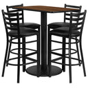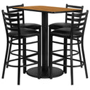 - Set includes one rectangular bar-height table and four ladder-back metal barstools with padded vinyl seats