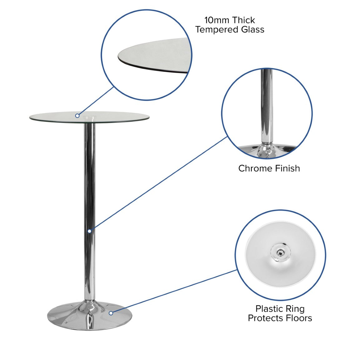 Add a sleek, modern focal point to your event space or home with this bar-height round glass table. Its compact footprint and contemporary chrome base provide versatile use for cocktail hours, seating placements, or decorative displays — perfect for venues where style and functionality matter.