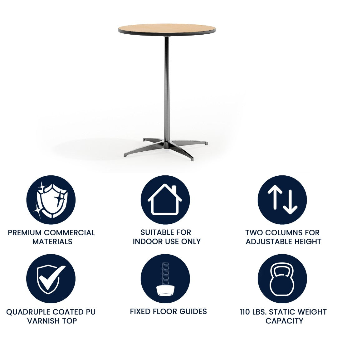 Bring timeless style and practical versatility to events, hospitality spaces, or everyday home use with this compact cocktail table. Designed for both seated and standing use, it assembles quickly, breaks down for transport, and resists wear in high-traffic environments—making it an ideal solution for banquets, conference centers, bars, breakfast nooks, and patios under cover.