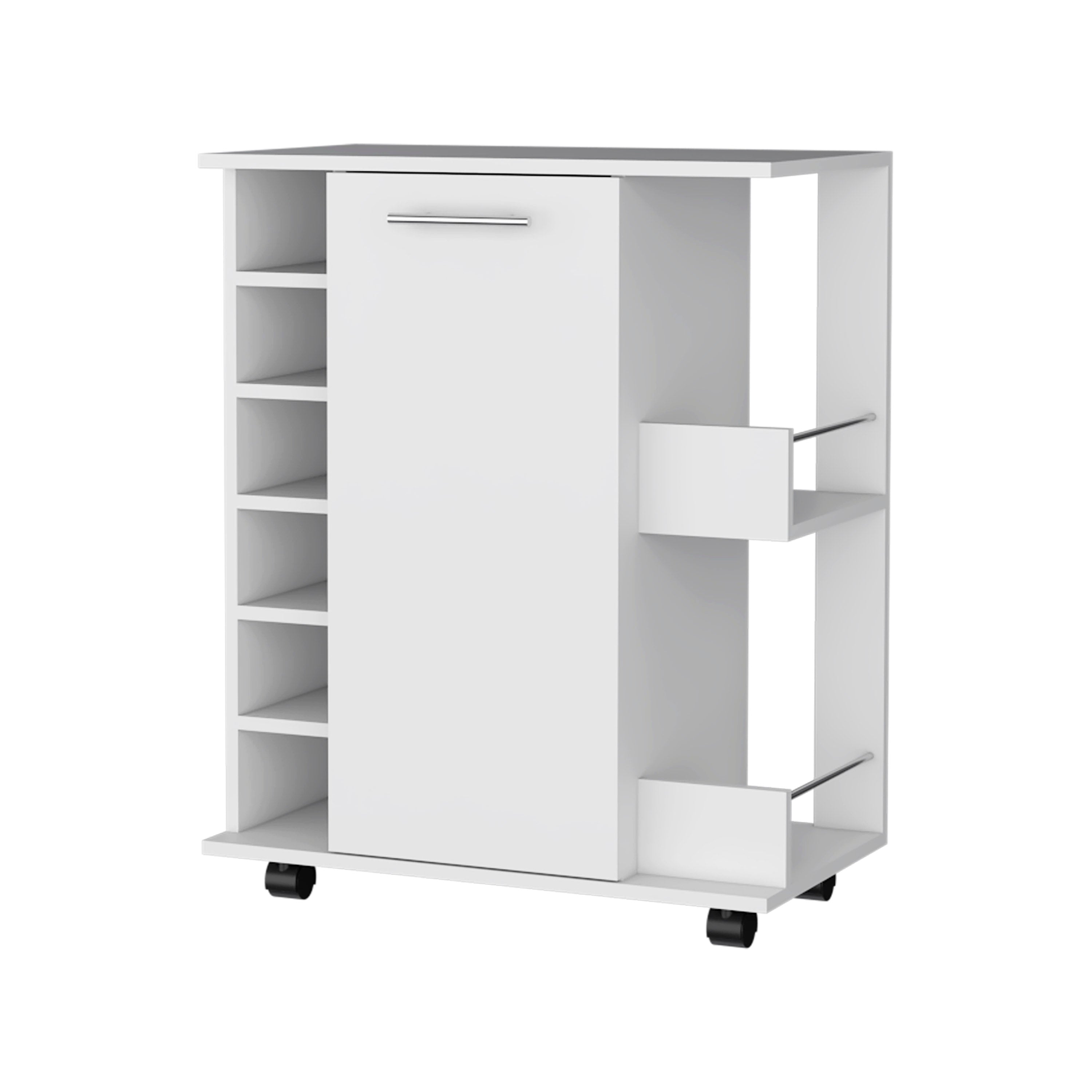Bring effortless style and smart organization to your gatherings with this Woodland Bar Cart. Designed for both form and function, it provides a generous work surface for mixing drinks, a dedicated wine rack, enclosed storage for delicate glassware, and open shelving for bottles, mixers, and display items. Smooth-rolling casters make it easy to move from kitchen to living area, while the clean white finish complements a variety of décor styles.