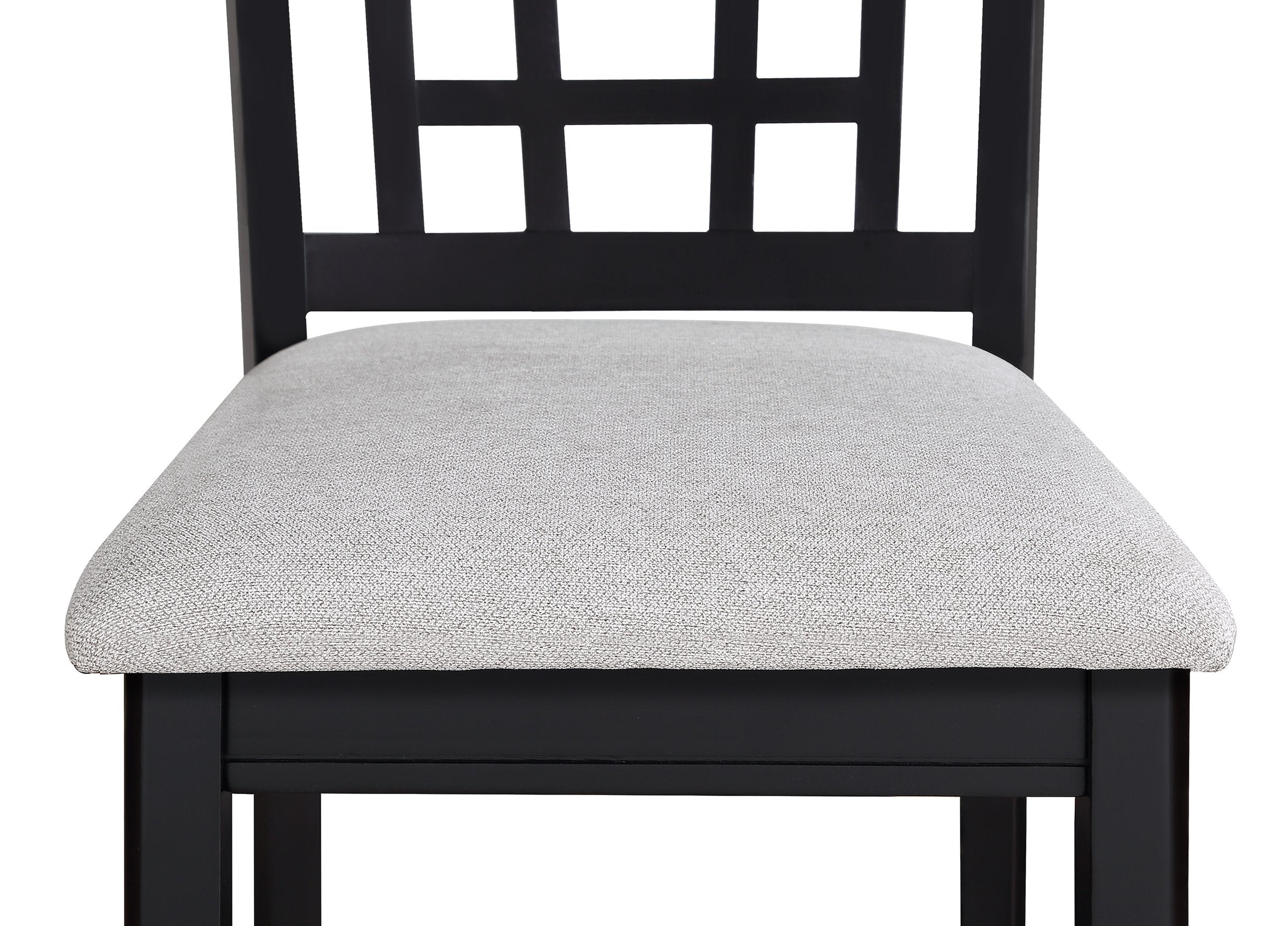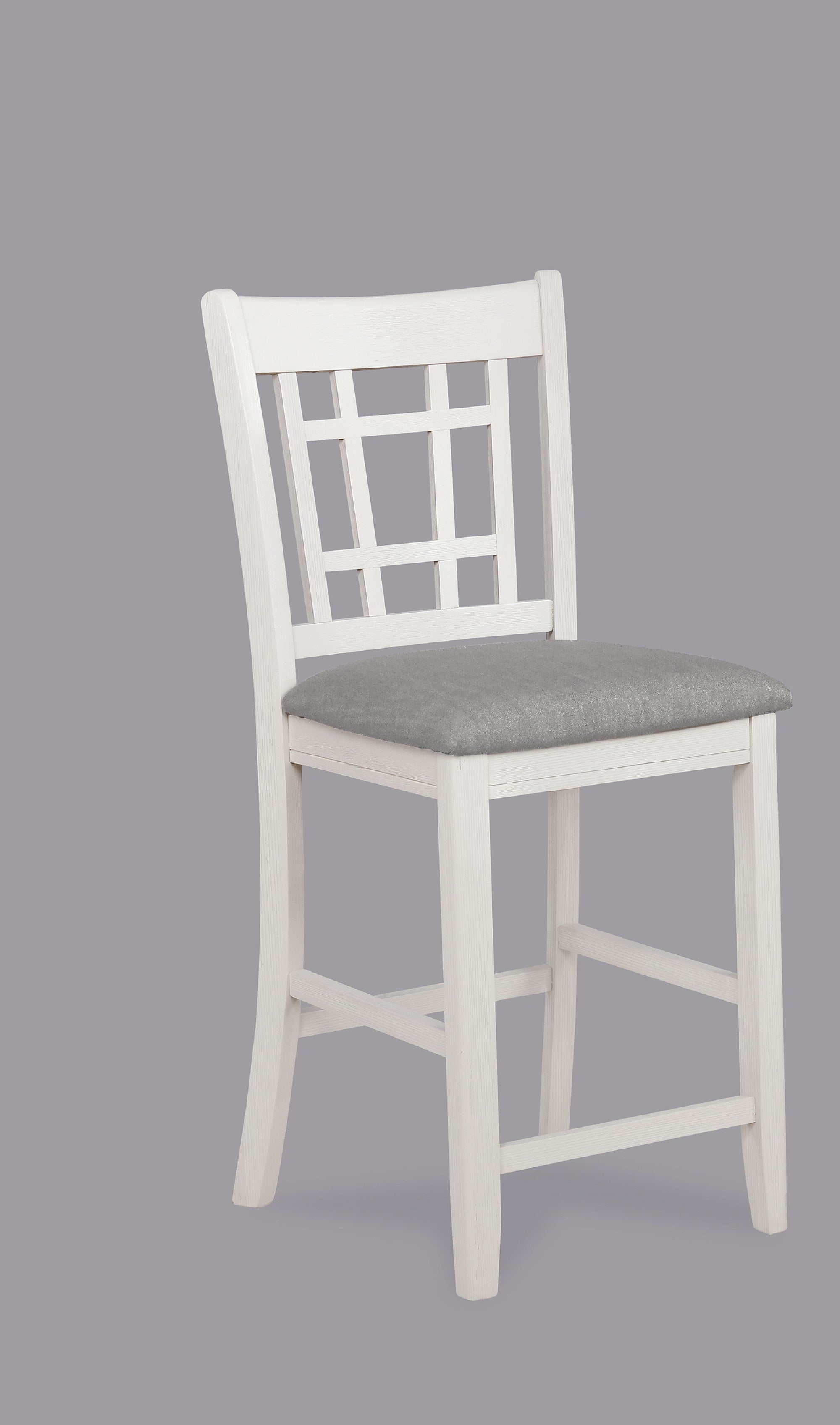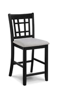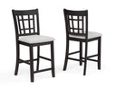 Elevate your dining or bar area with this pair of counter-height upholstered pub chairs, blending casual farmhouse charm and modern comfort. These solid wood chairs feature a refined lattice back, cushioned light-gray upholstery, and sturdy construction—an ideal choice for everyday use, entertaining, or relaxed breakfasts.