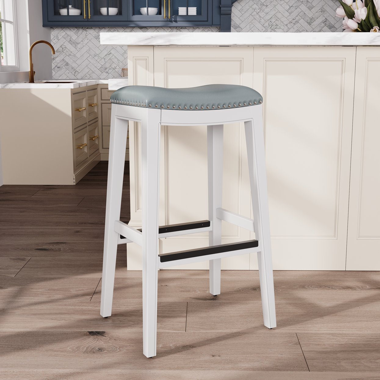 Enjoy elevated comfort and timeless style with this 30" bar-height saddle stool in a crisp white finish and gray bonded leather seat. Its contoured saddle design encourages lingering conversation, while durable construction and refined details—like nailhead trim and metal footplates—make it a practical, attractive addition to any kitchen, home bar, or dining space.