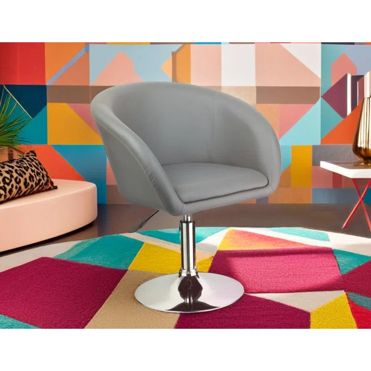 Give your dining room, kitchen, or casual seating area a sleek, contemporary upgrade with this adjustable faux leather swivel barrel chair. Designed for comfort and versatility, it pairs modern gray upholstery with a chrome-finish metal base for a polished look that suits both home and office settings. The chair’s adjustable height and 360° swivel make it ideal for dining, counter seating, or as a stylish accent seat.