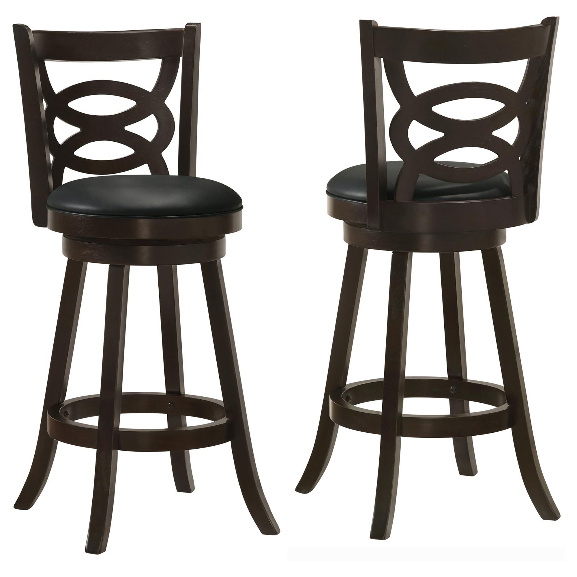 Elevate your kitchen or home bar with this refined set of two cappuccino swivel bar stools, which blend classic silhouettes with contemporary details for a versatile transitional look. Crafted with warm espresso finishes and comfortable leatherette seats, these stools offer smooth 360° swiveling motion and sturdy construction for everyday use—perfect for casual dining, entertaining, or adding a polished accent to your space.