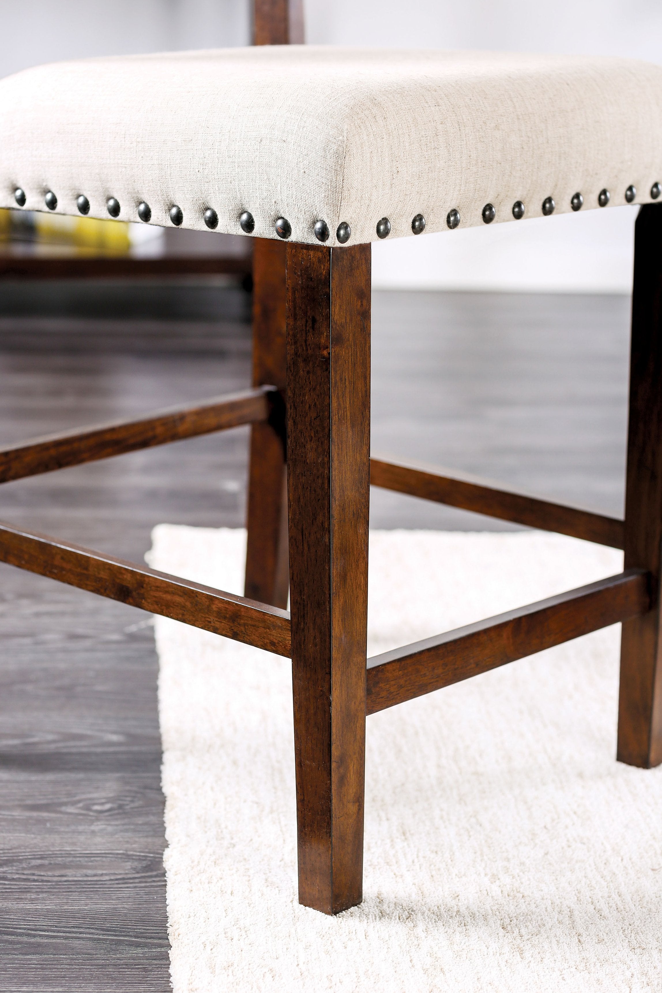 Elevate your dining space with this timeless set of two counter-height chairs that blend farmhouse charm and modern simplicity. Finished in a warm brown-cherry solid wood frame, each chair features an ivory linen-padded seat with nailhead trim for a refined, rustic accent. Sturdy construction and comfortable upholstery make these chairs ideal for everyday meals, casual entertaining, or a stylish kitchen counter seating solution.