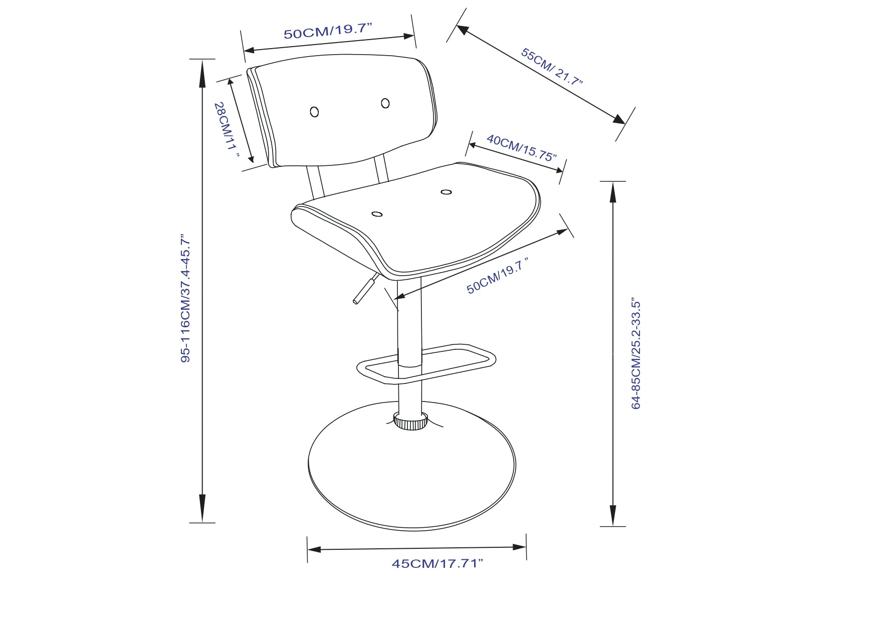 - Base & Functionality: Sturdy polished chrome base includes a footrest, 360° swivel, and gas-lift mechanism to easily adjust from counter to bar height.