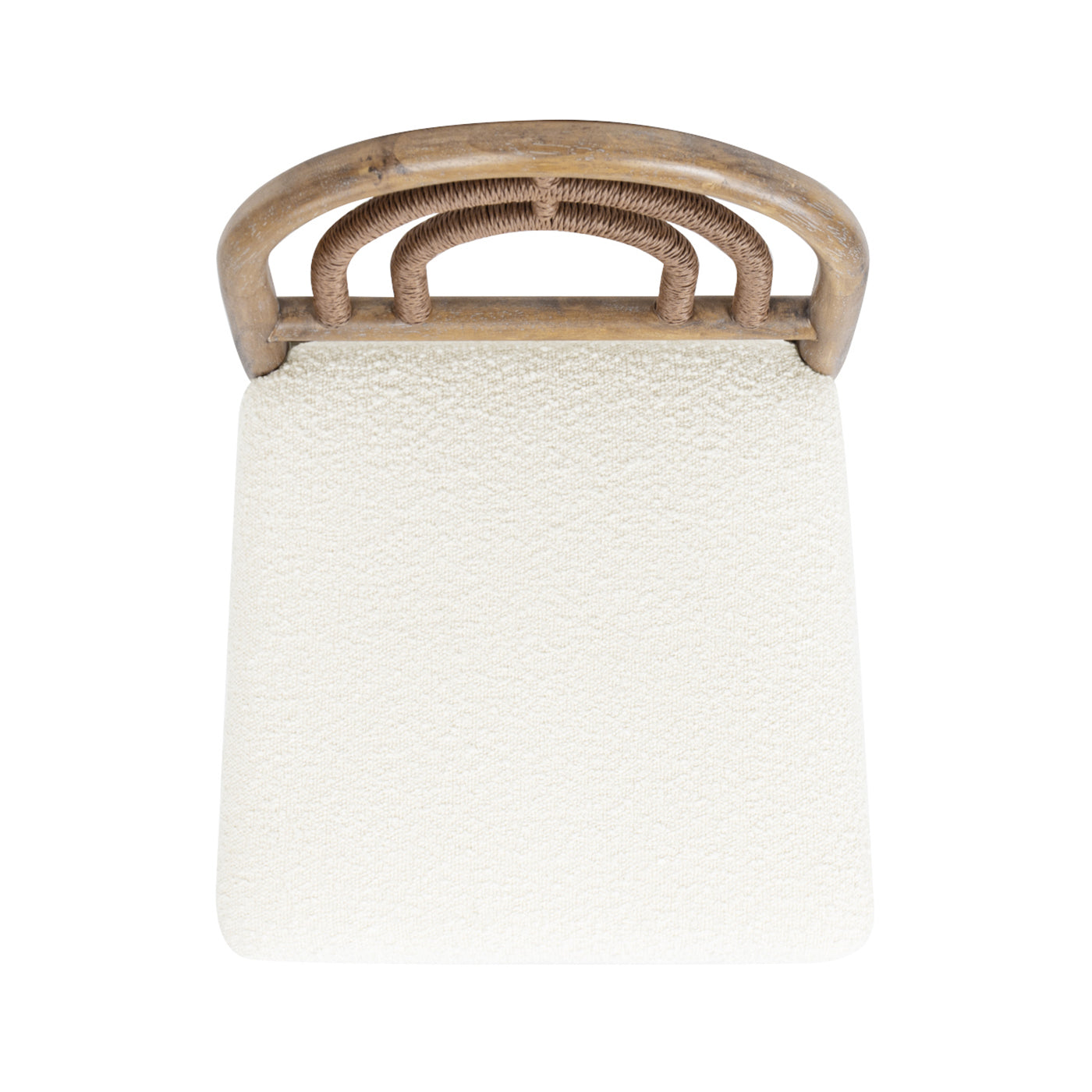 - Upholstery: Ivory white boucle fabric provides a soft, boucle-textured seat surface that’s comfortable for extended dining.