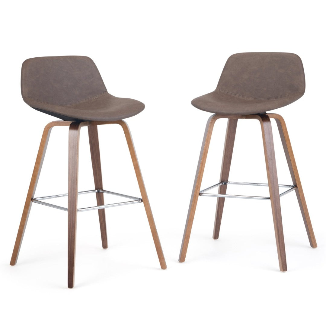 Bring Mid-Century flair and comfortable support to your kitchen, bar, or entertainment area with this pair of Randolph bentwood stools. Expertly crafted with a molded bentwood frame and distressed vegan leather upholstery, these counter/bar height stools combine vintage styling with modern durability for everyday use and easy room integration.