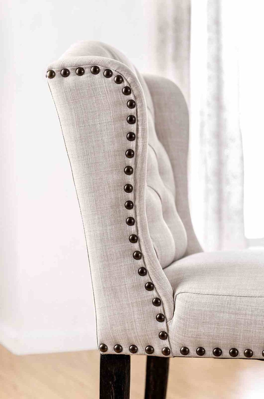 - Design Details: Wingback silhouette, button tufting, and nailhead trim for refined styling