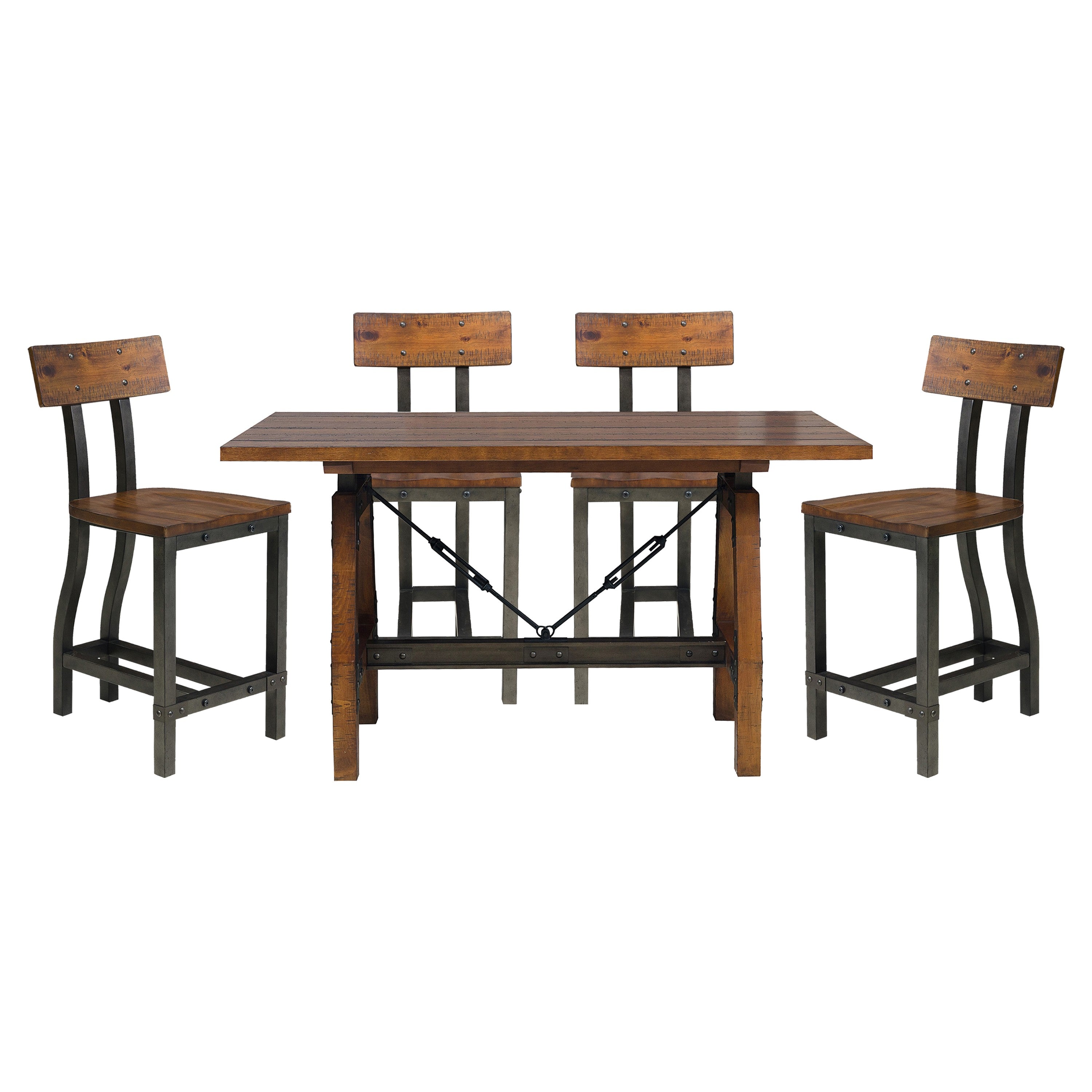 Elevate your dining area with this industrial-inspired 7-piece counter-height dining set, blending rustic brown warmth with gunmetal accents for an eye-catching yet functional focal point. Crafted with acacia veneer and sturdy gunmetal-finished framing, the set offers durable construction and distinctive detailing—like faux rivets and exposed metal brackets—that bring authentic industrial character to everyday meals and gatherings.