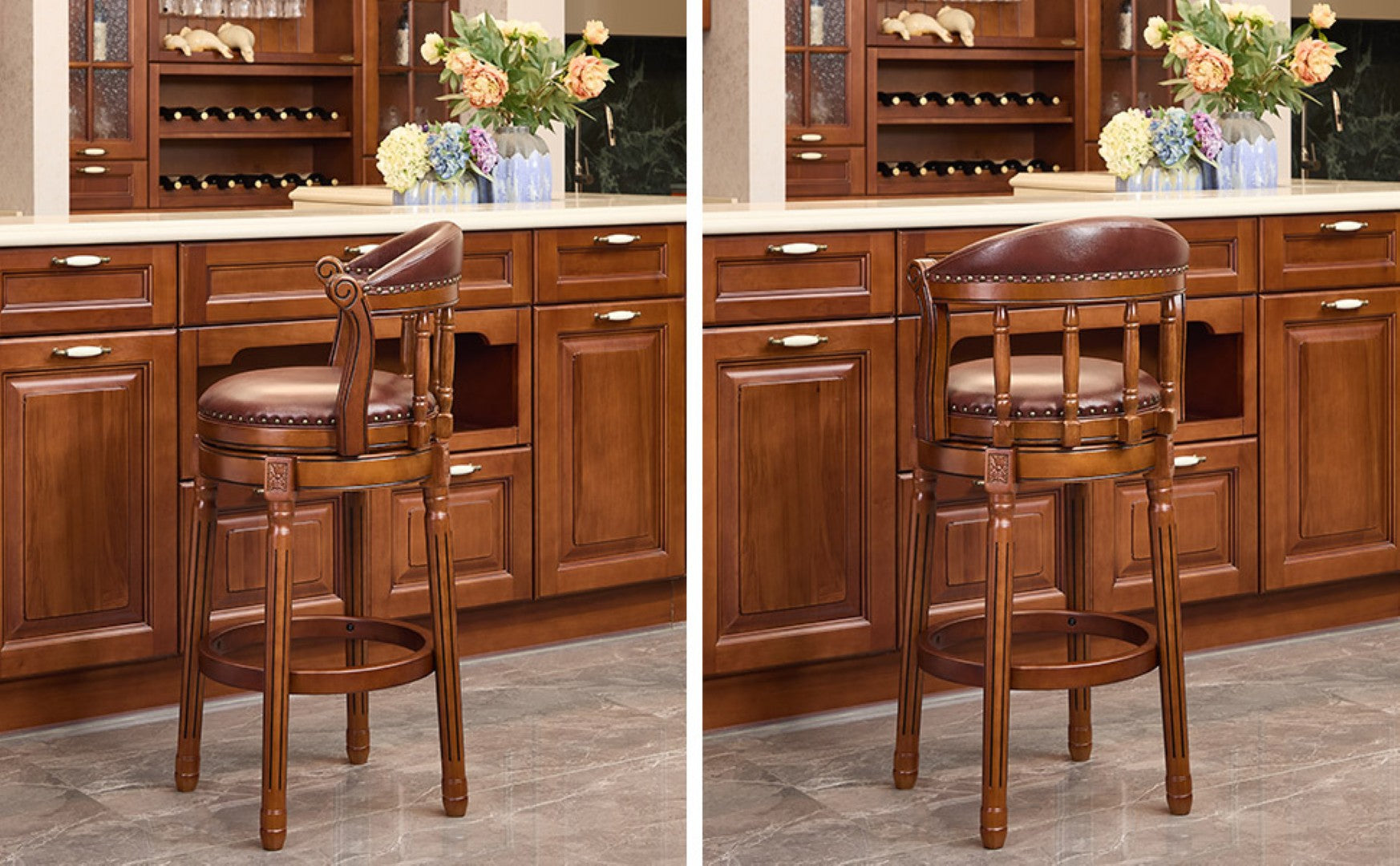 Enjoy comfortable, stylish seating at your counter with this cow-top leather wooden bar stool. Designed for everyday use in kitchens, home bars, restaurants, or study nooks, it combines a contoured back, 360° swivel, and solid hardwood construction for a blend of durability and classic charm.