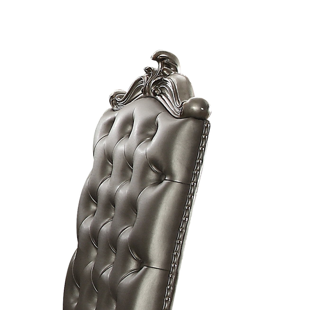 Elevate your kitchen, island, or bar area with these elegant tufted counter height chairs. Combining classic tufted styling with a refined antique platinum finish and silver upholstery, this set of two delivers both comfort and visual sophistication. Sturdy construction and thoughtful padding make them ideal for dining, entertaining, or casual work—bringing a timeless yet versatile presence to a variety of interiors.