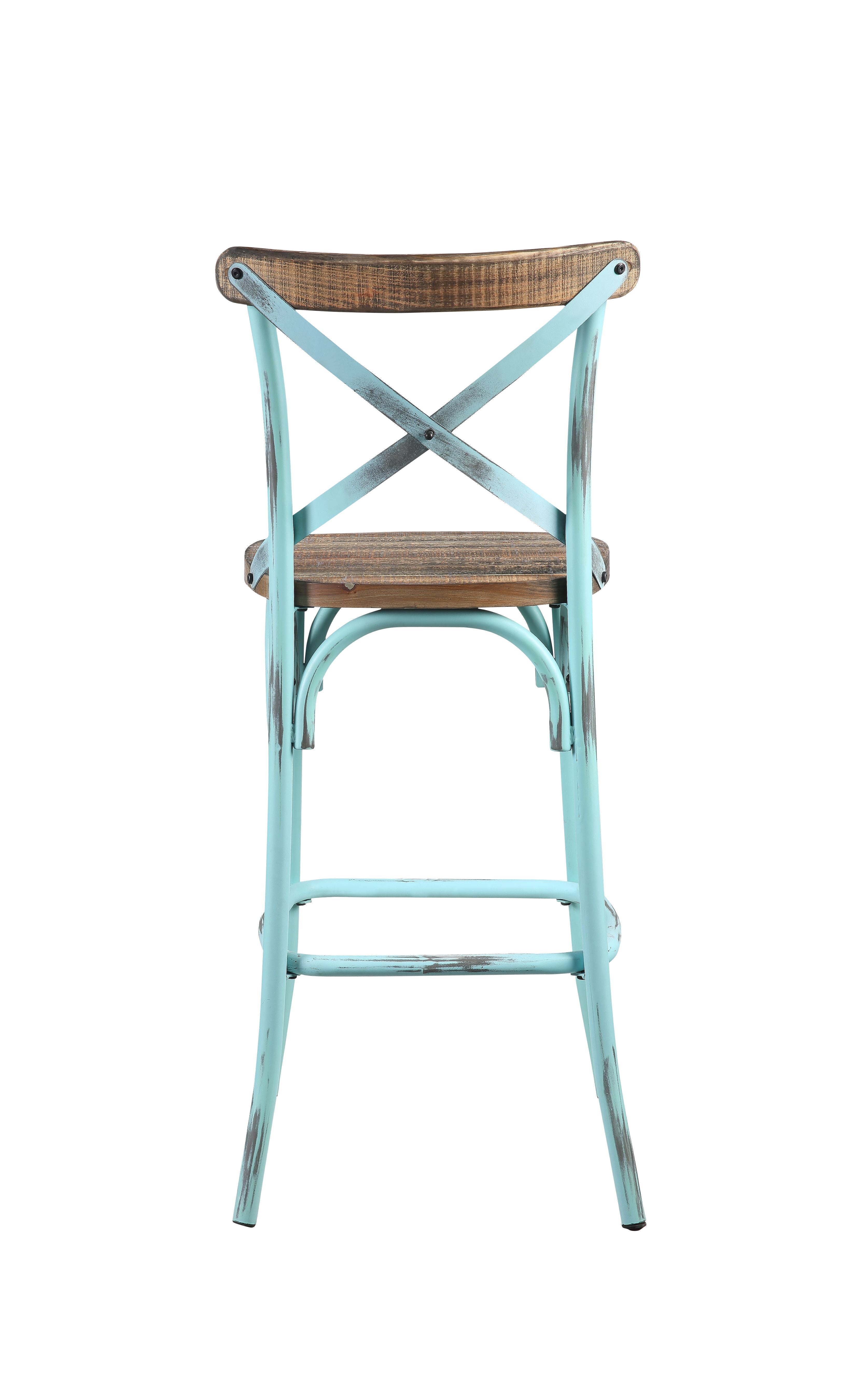 Bring vintage-industrial charm to your bar or kitchen island with this Zaire bar chair, featuring a distressed turquoise finish paired with warm antique oak. Its armless, high-back silhouette and metal "X" back detail create a stylish focal point while the splayed metal legs and integrated footrest provide stable, comfortable seating for everyday use.