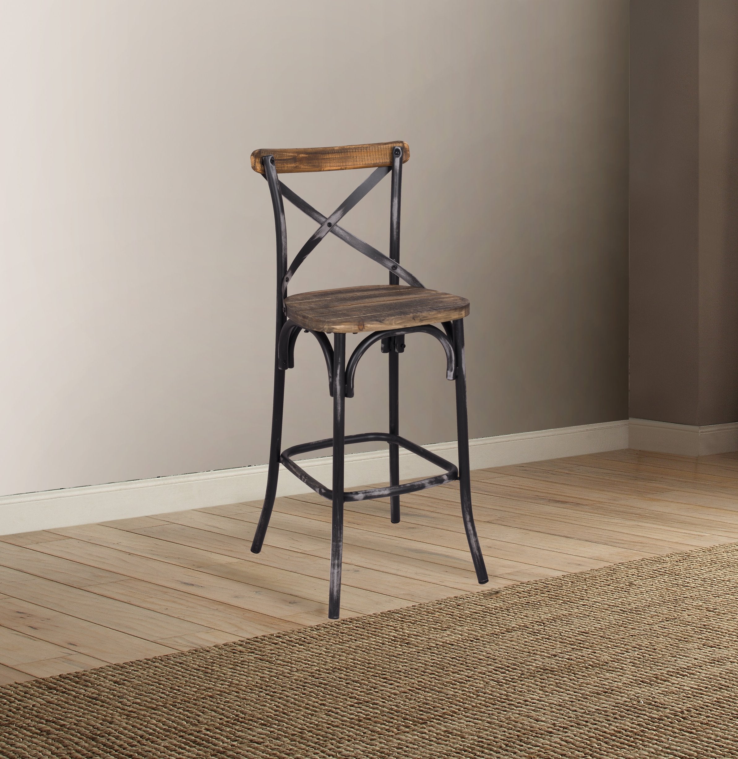 - Armless Bar Chair (High Backrest), Vintage/Industrial Style, Stationary Seat, Wooden Seat: Antique Oak Finish, Metal & Wood Backrest (Wood Top Trim & Metal "X" Shape), Metal Splayed Legs and Footrests support