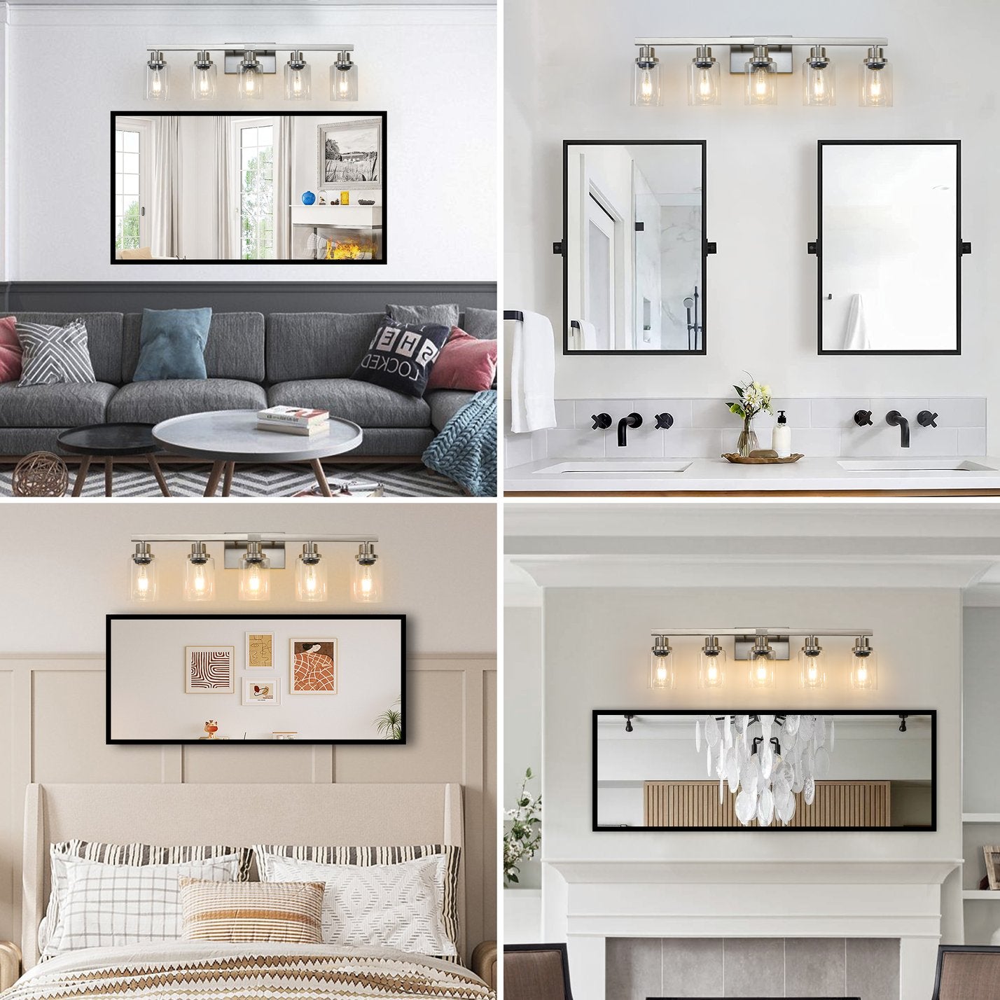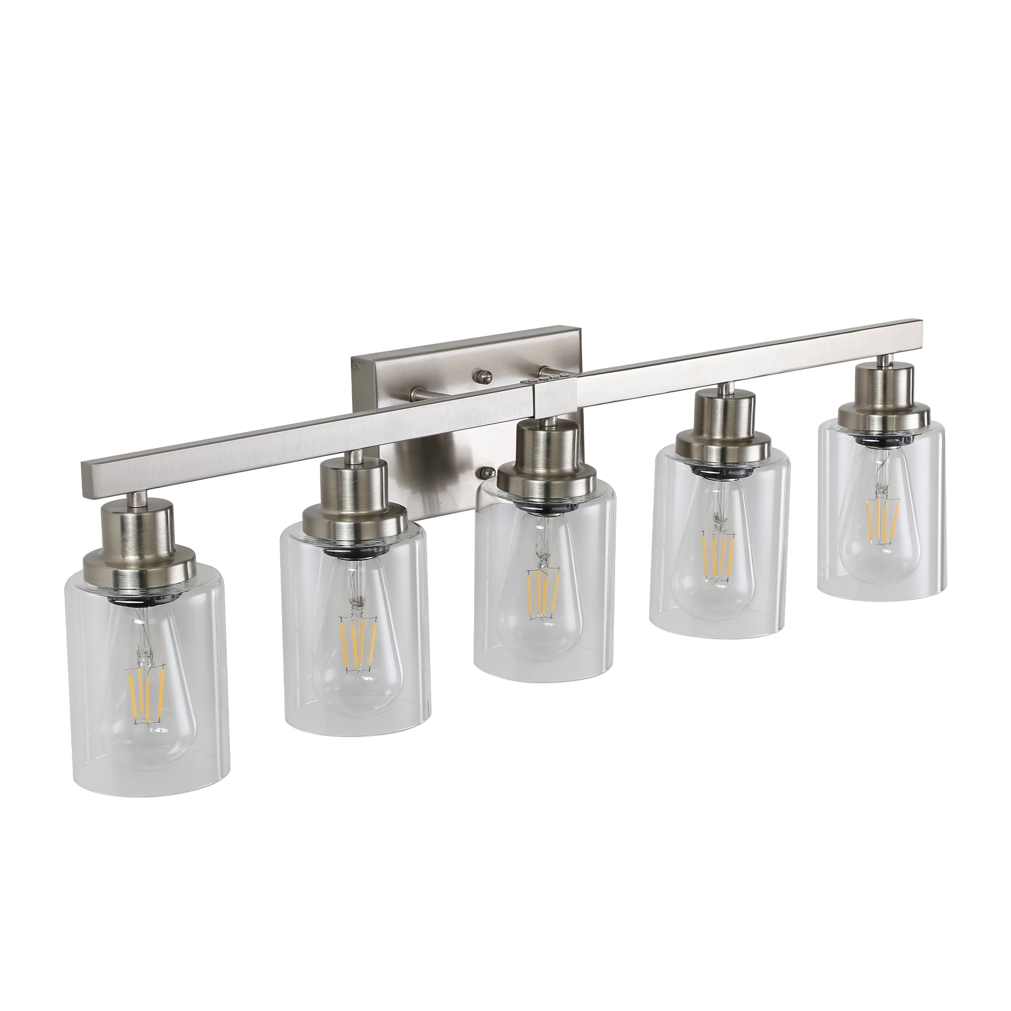 Add a sleek, contemporary focal point to your bathroom or dressing area with this 31" modern 5-light vanity fixture. Finished in brushed nickel and paired with clear glass shades, it provides bright, flattering illumination ideal for grooming, makeup application, and general task lighting while complementing a wide range of décor styles.